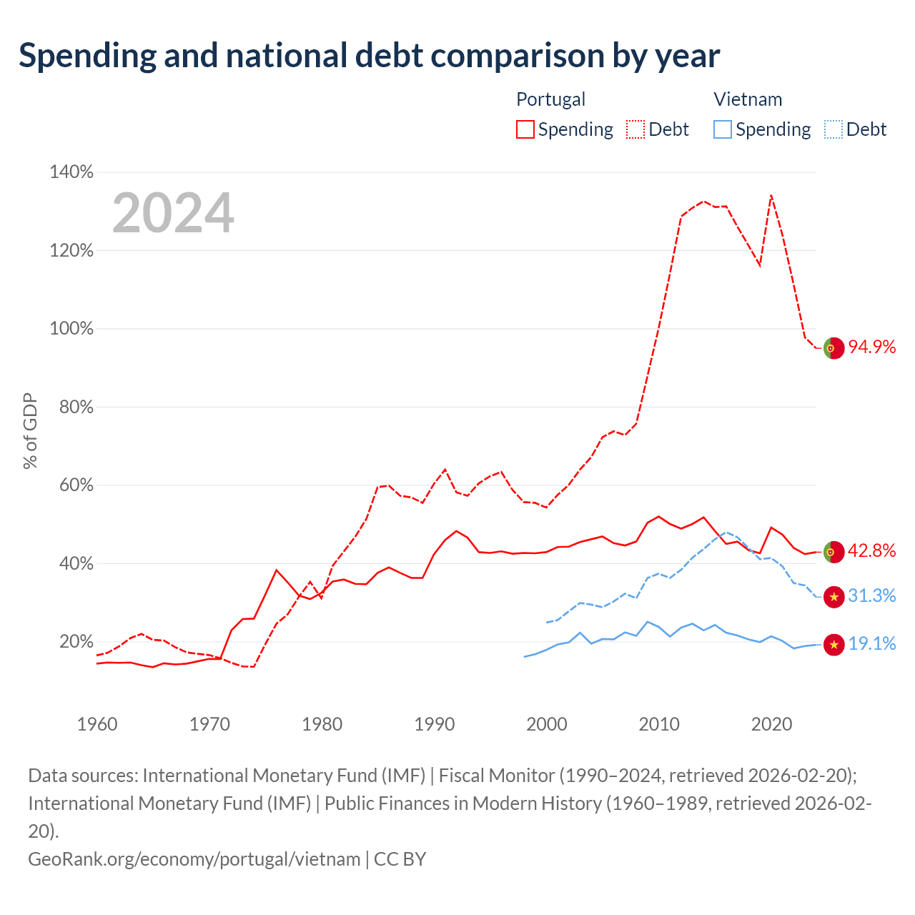 Portugal has $297B in government debt (94.9% of GDP), compared to $149B (31.3% of GDP) in Vietnam.