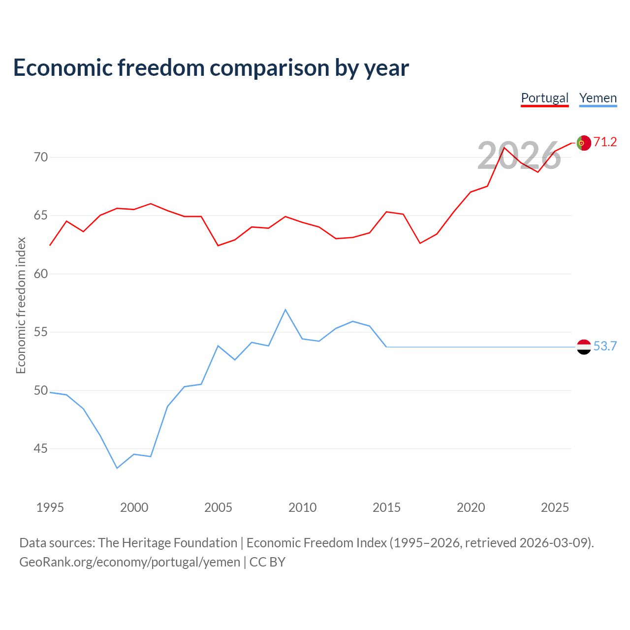 The Economic Freedom Index for Portugal is 71.2, ranking 33/197, compared to 53.7 for Yemen, ranking 138/197. The chart above displays a comparison of annual changes in economic freedom indexes.