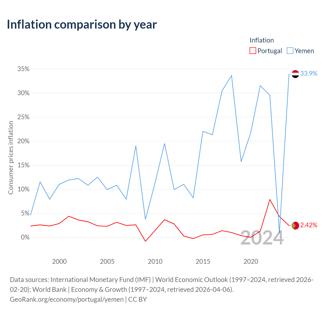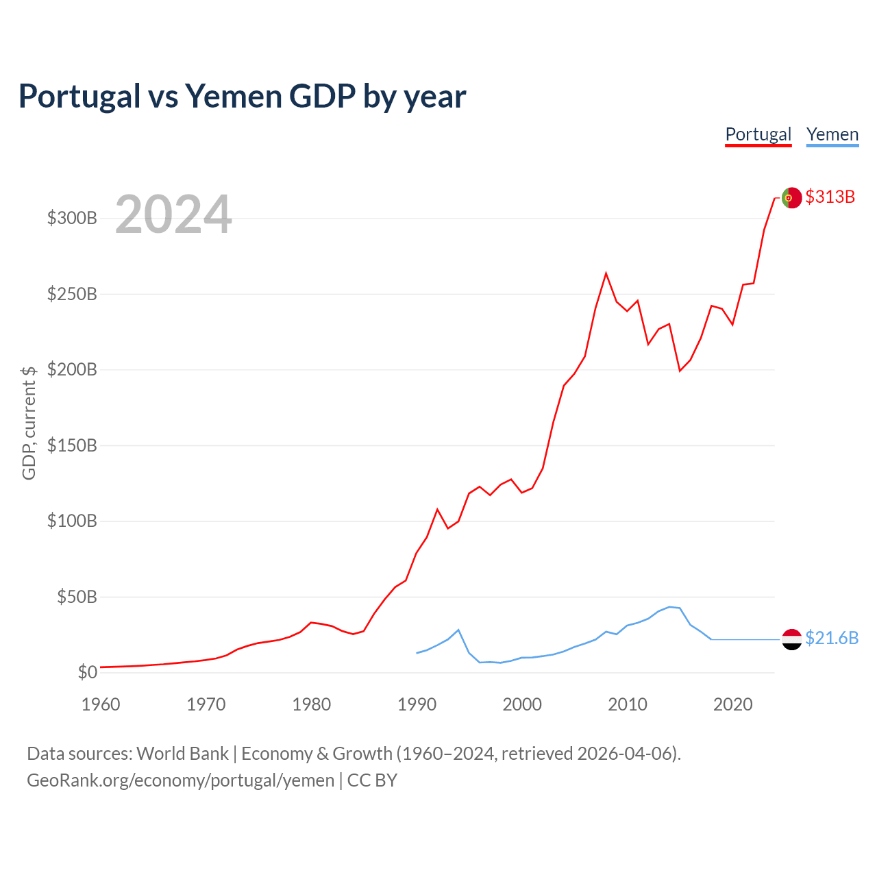 Portugal has a GDP of $313B compared to $21.6B for Yemen, ranking 46/197 and 125/197 by economy size, respectively.