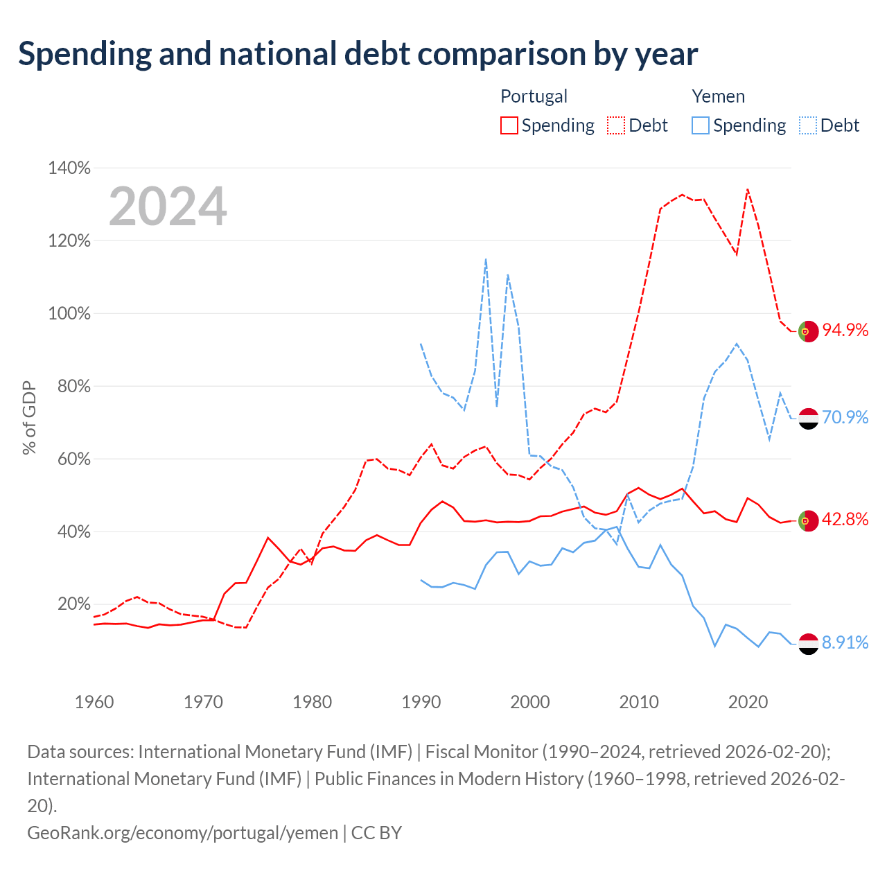 Portugal has $297B in government debt (94.9% of GDP), compared to $18.8B (70.9% of GDP) in Yemen.