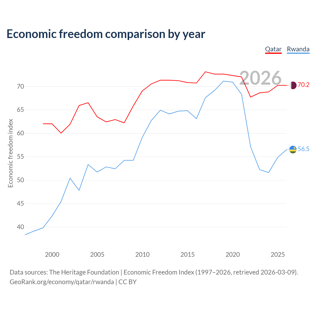 The Economic Freedom Index for Qatar is 70.2, ranking 37/197, compared to 56.5 for Rwanda, ranking 121/197. The chart above displays a comparison of annual changes in economic freedom indexes.