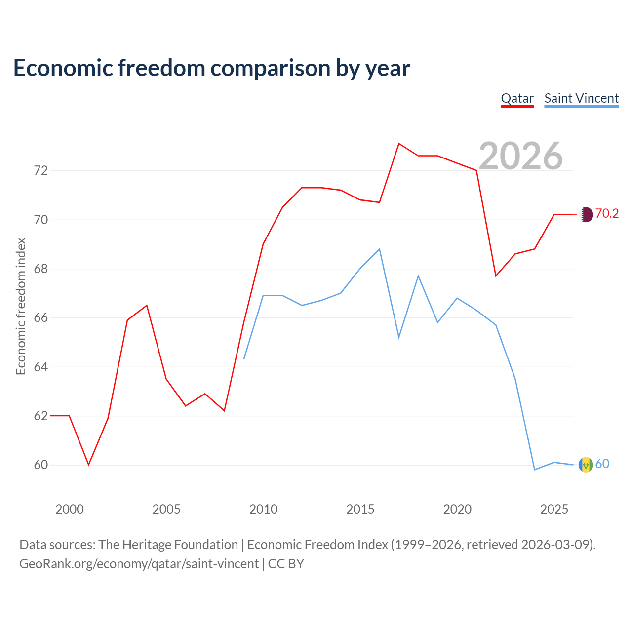 The Economic Freedom Index for Qatar is 70.2, ranking 37/197, compared to 60 for Saint Vincent, ranking 98/197. The chart above displays a comparison of annual changes in economic freedom indexes.