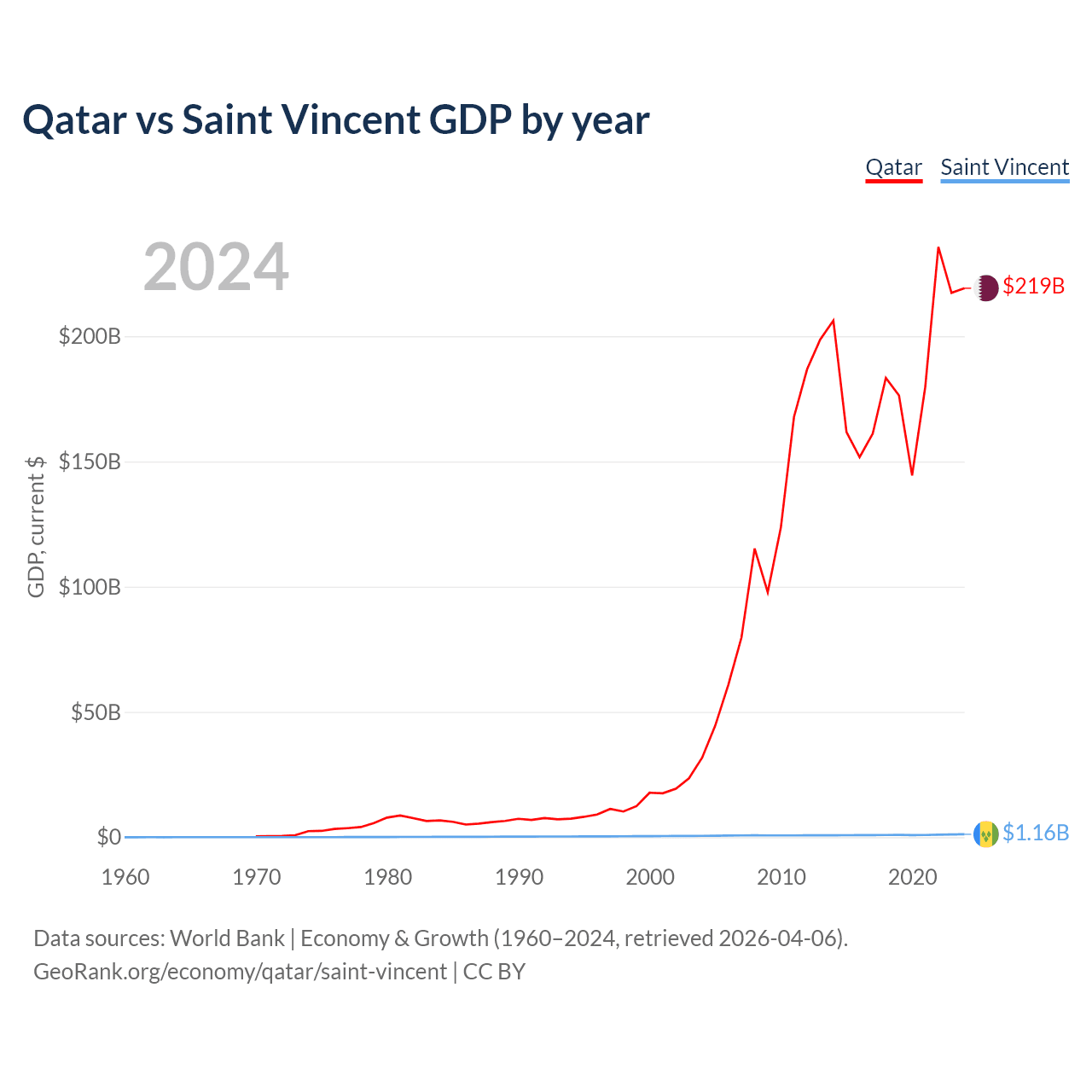 Qatar has a GDP of $219B compared to $1.16B for Saint Vincent, ranking 56/197 and 186/197 by economy size, respectively.