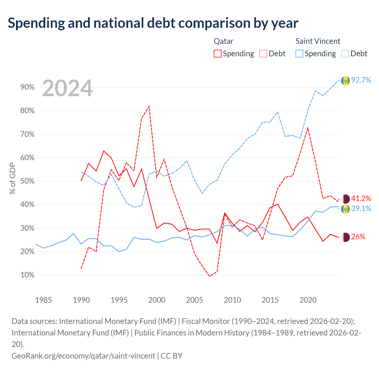 Qatar has $90.2B in government debt (41.2% of GDP), compared to $1.07B (92.7% of GDP) in Saint Vincent.
