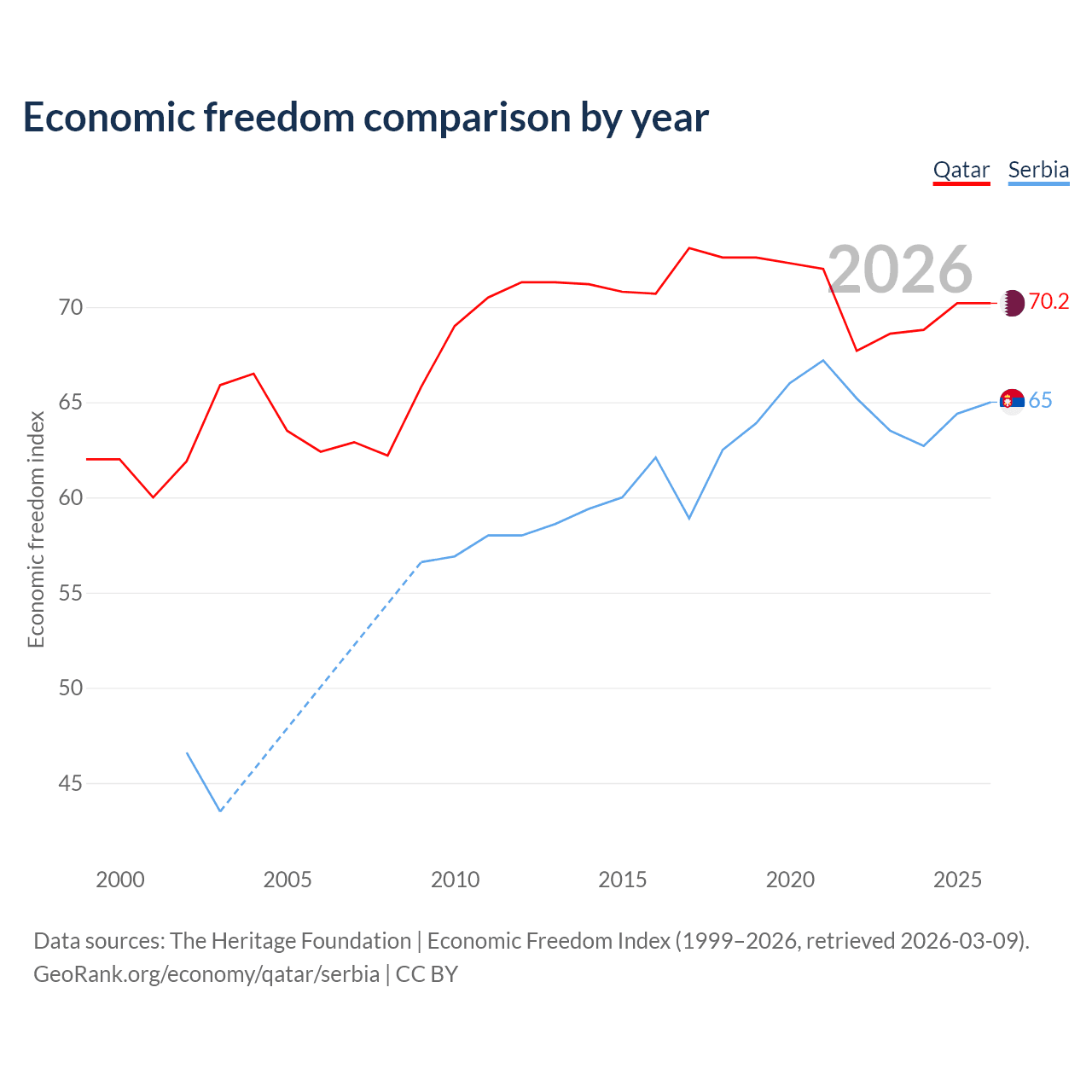 The Economic Freedom Index for Qatar is 70.2, ranking 37/197, compared to 65 for Serbia, ranking 68/197. The chart above displays a comparison of annual changes in economic freedom indexes.