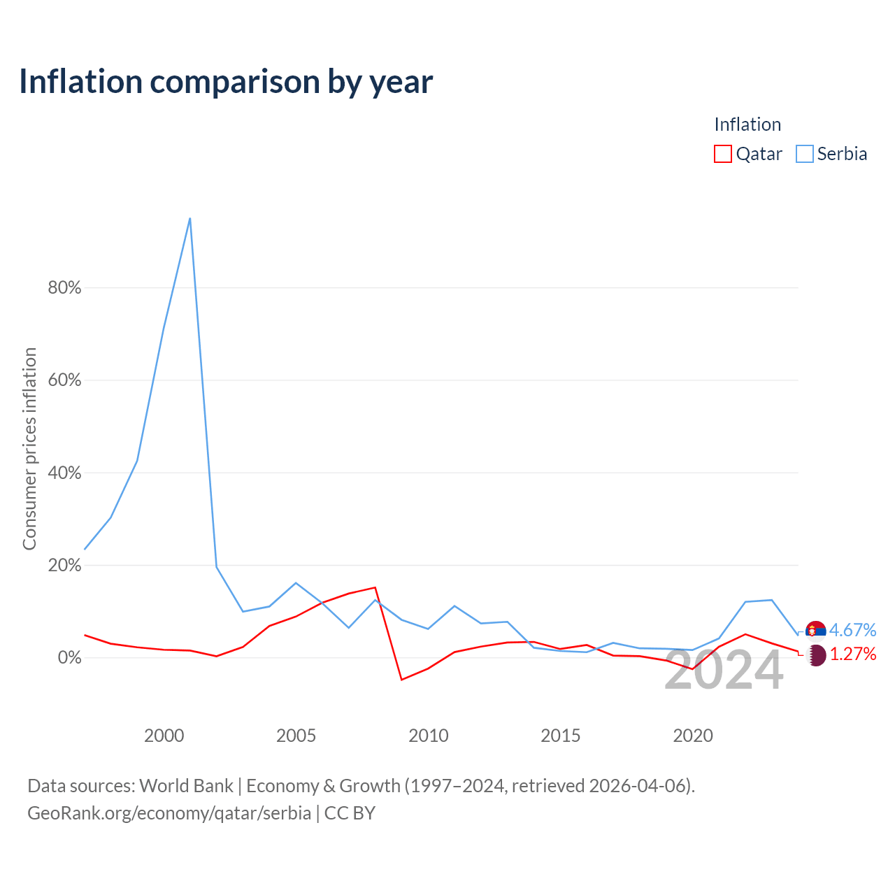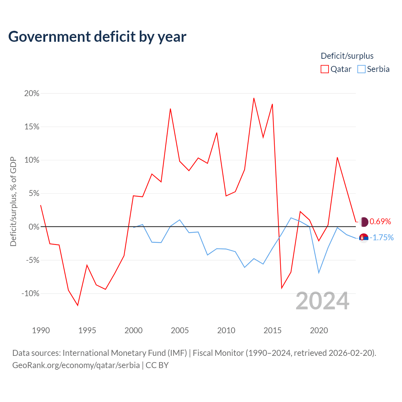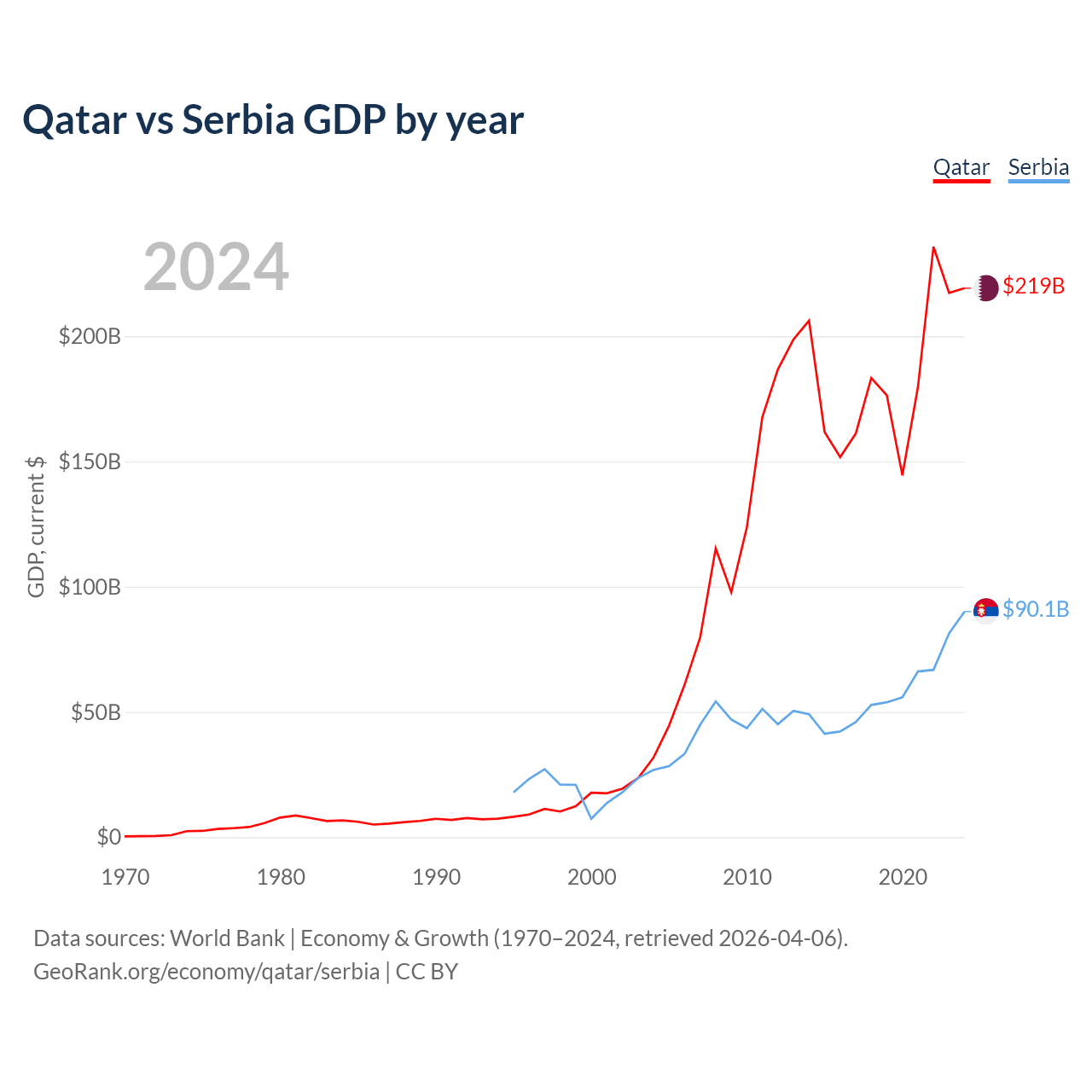 Qatar has a GDP of $219B compared to $90.1B for Serbia, ranking 56/197 and 76/197 by economy size, respectively.