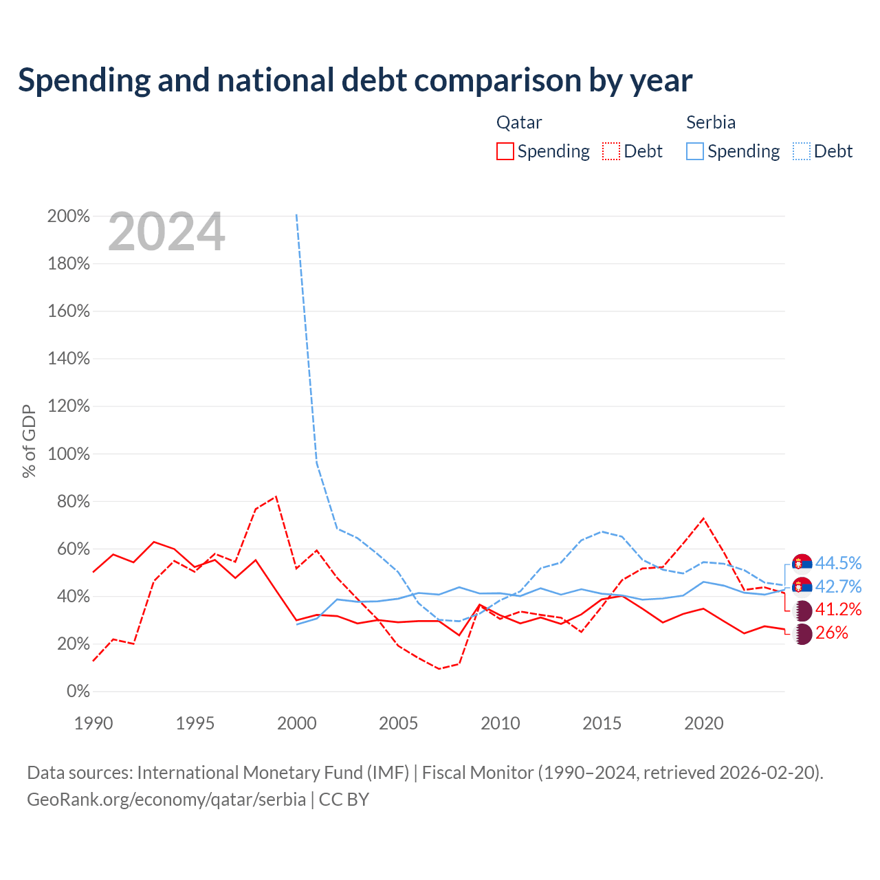 Qatar has $90.2B in government debt (41.2% of GDP), compared to $40.1B (44.5% of GDP) in Serbia.