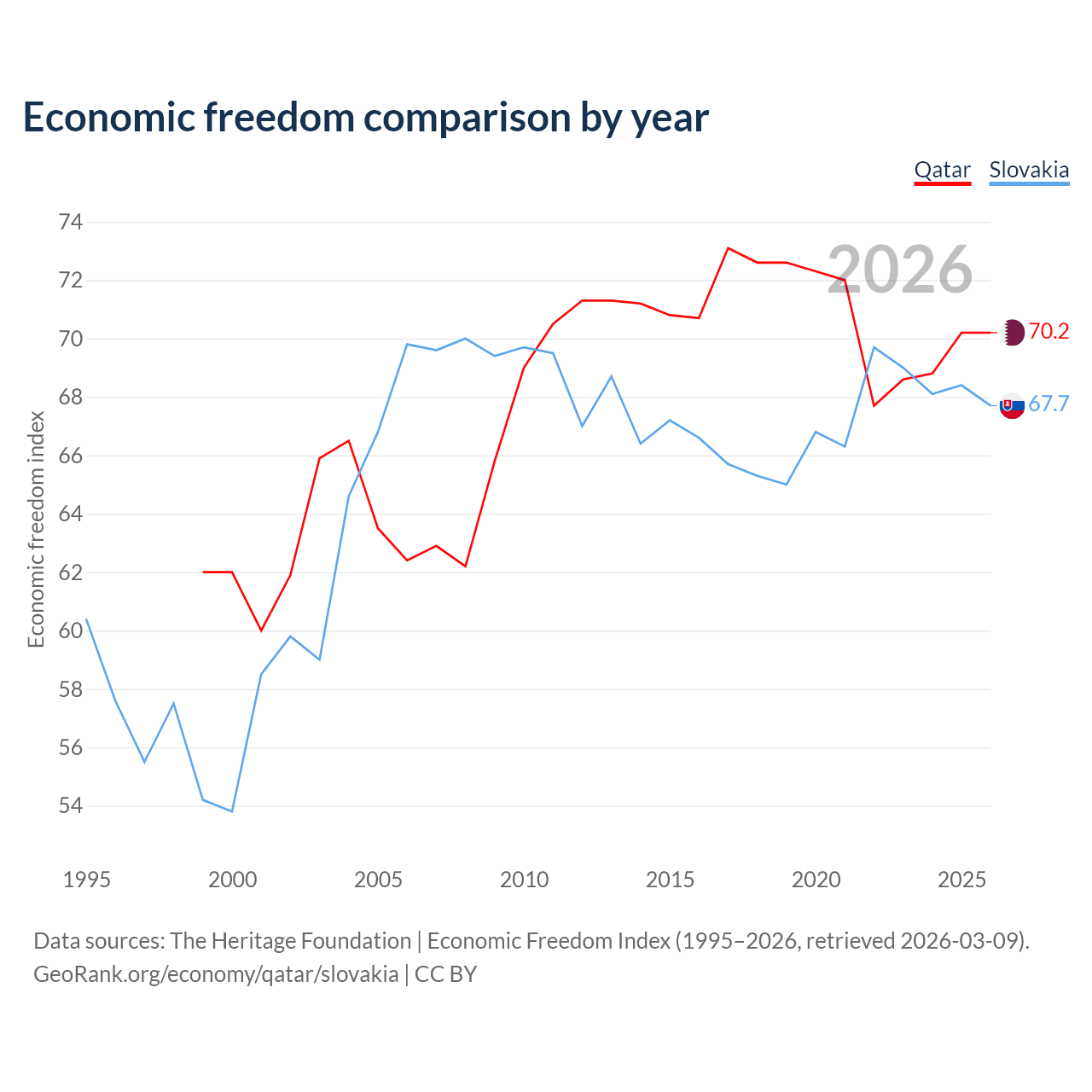 The Economic Freedom Index for Qatar is 70.2, ranking 37/197, compared to 67.7 for Slovakia, ranking 54/197. The chart above displays a comparison of annual changes in economic freedom indexes.