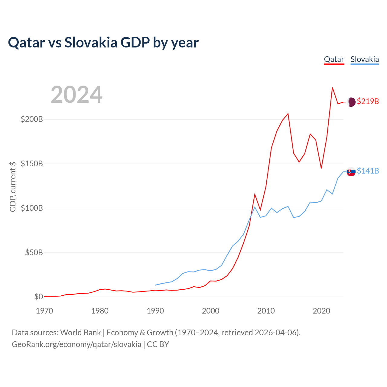 Qatar has a GDP of $219B compared to $141B for Slovakia, ranking 56/197 and 61/197 by economy size, respectively.