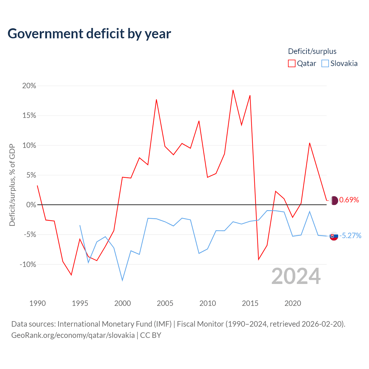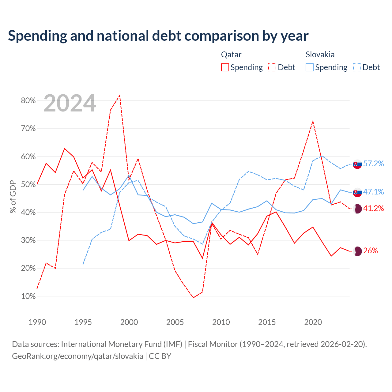 Qatar has $90.2B in government debt (41.2% of GDP), compared to $80.7B (57.2% of GDP) in Slovakia.