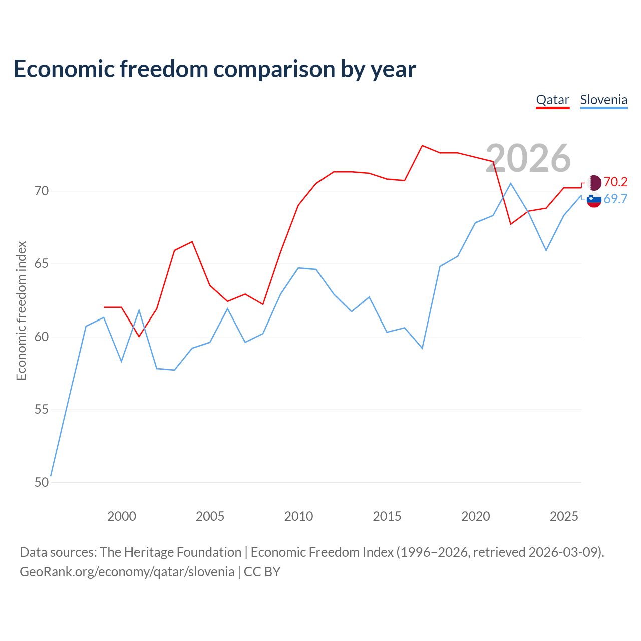 The Economic Freedom Index for Qatar is 70.2, ranking 37/197, compared to 69.7 for Slovenia, ranking 40/197. The chart above displays a comparison of annual changes in economic freedom indexes.