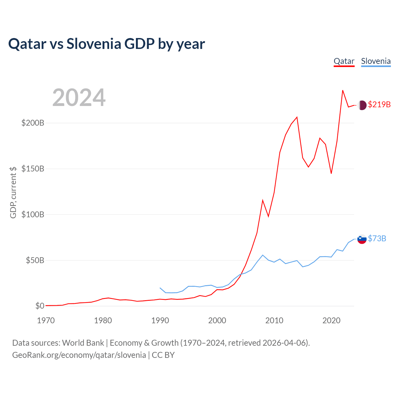 Qatar has a GDP of $219B compared to $73B for Slovenia, ranking 56/197 and 86/197 by economy size, respectively.