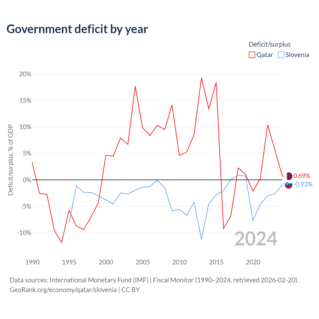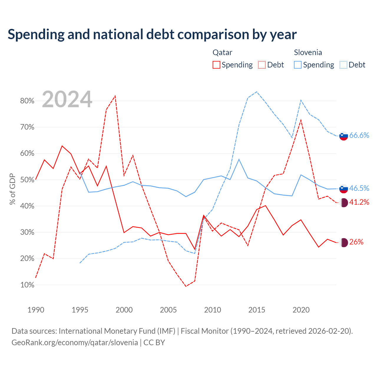 Qatar has $90.2B in government debt (41.2% of GDP), compared to $48.6B (66.6% of GDP) in Slovenia.