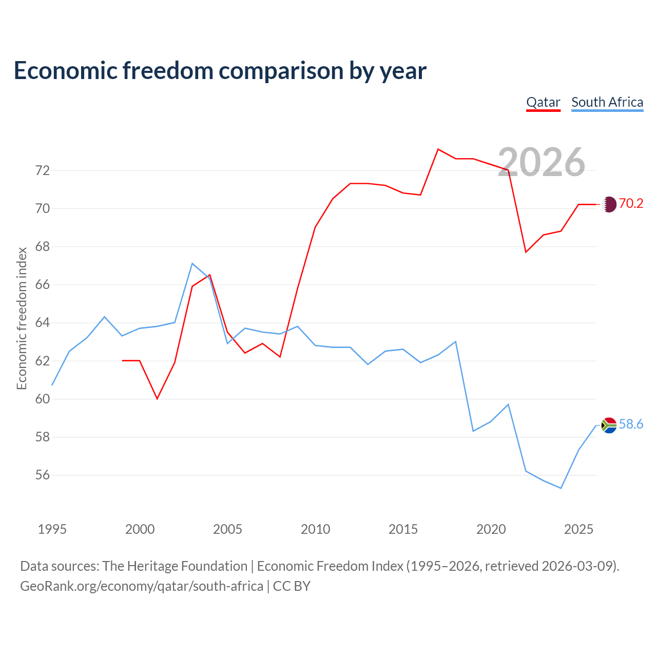 The Economic Freedom Index for Qatar is 70.2, ranking 37/197, compared to 58.6 for South Africa, ranking 110/197. The chart above displays a comparison of annual changes in economic freedom indexes.