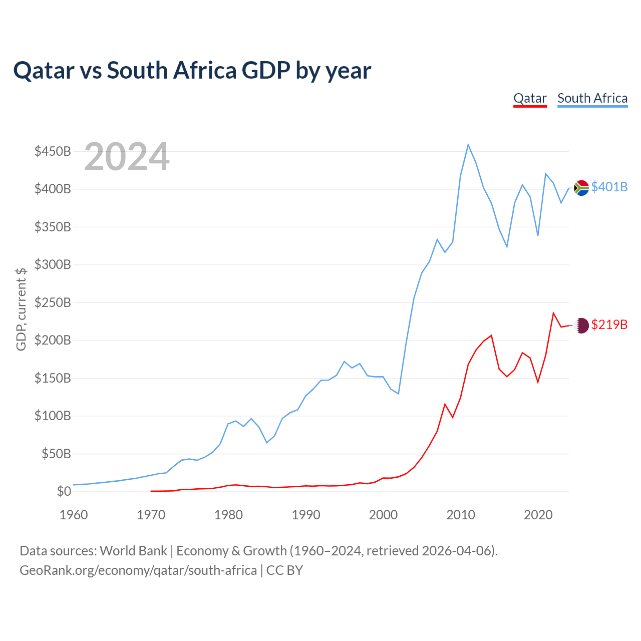 Qatar has a GDP of $219B compared to $401B for South Africa, ranking 56/197 and 40/197 by economy size, respectively.