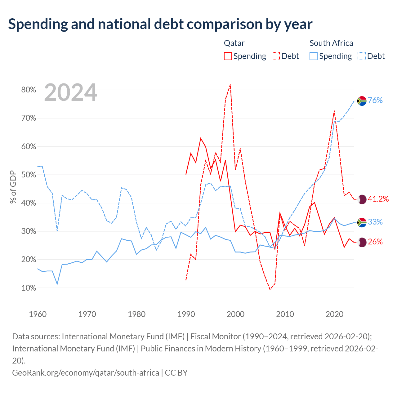 Qatar has $90.2B in government debt (41.2% of GDP), compared to $305B (76% of GDP) in South Africa.