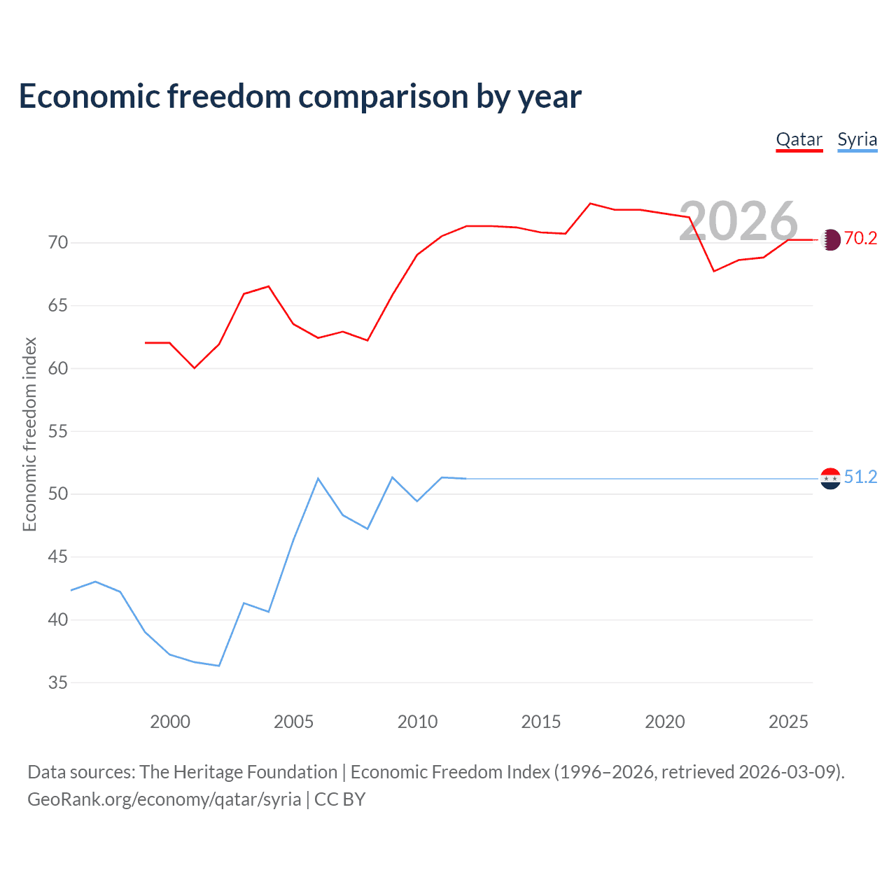 The Economic Freedom Index for Qatar is 70.2, ranking 37/197, compared to 51.2 for Syria, ranking 155/197. The chart above displays a comparison of annual changes in economic freedom indexes.