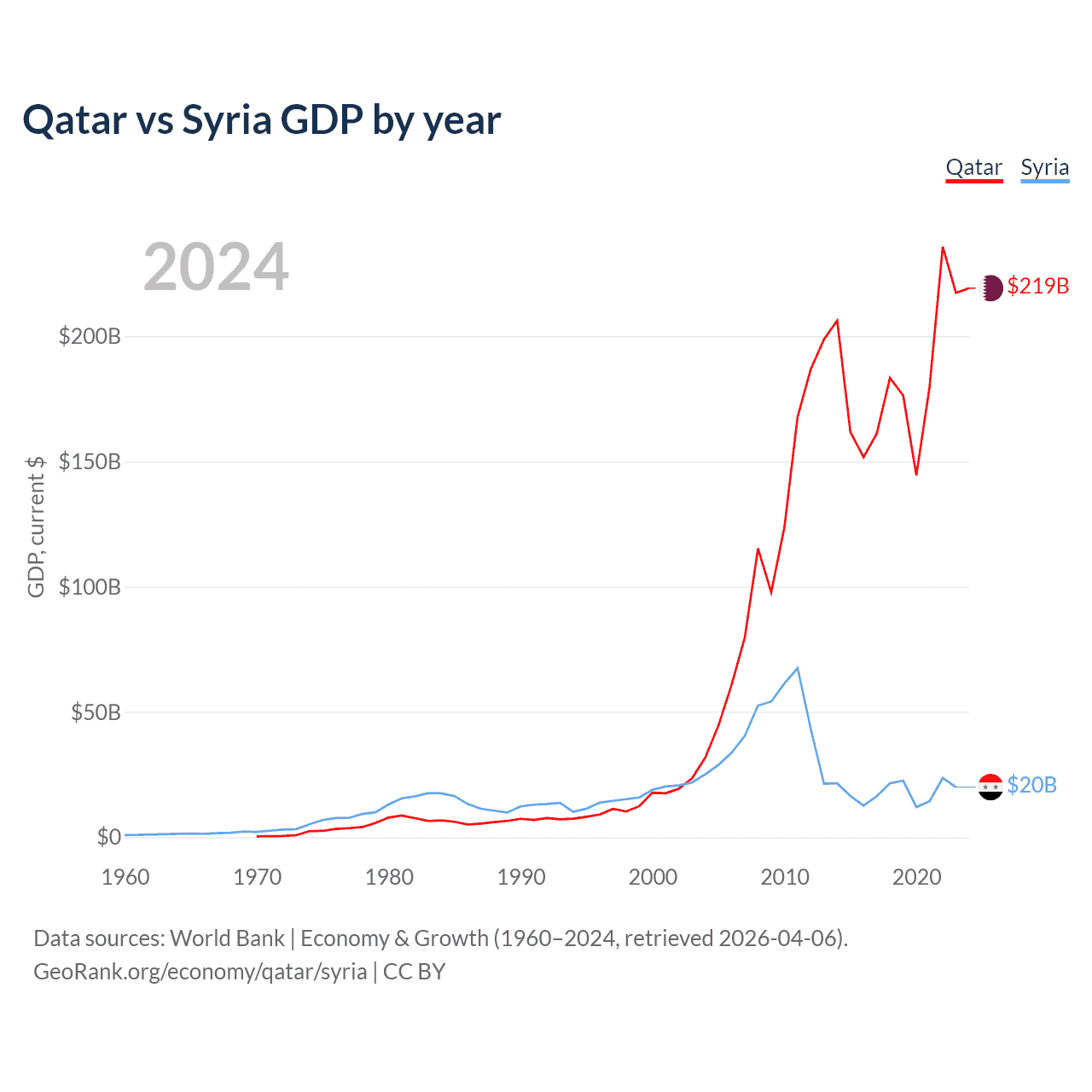 Qatar has a GDP of $219B compared to $20B for Syria, ranking 56/197 and 129/197 by economy size, respectively.