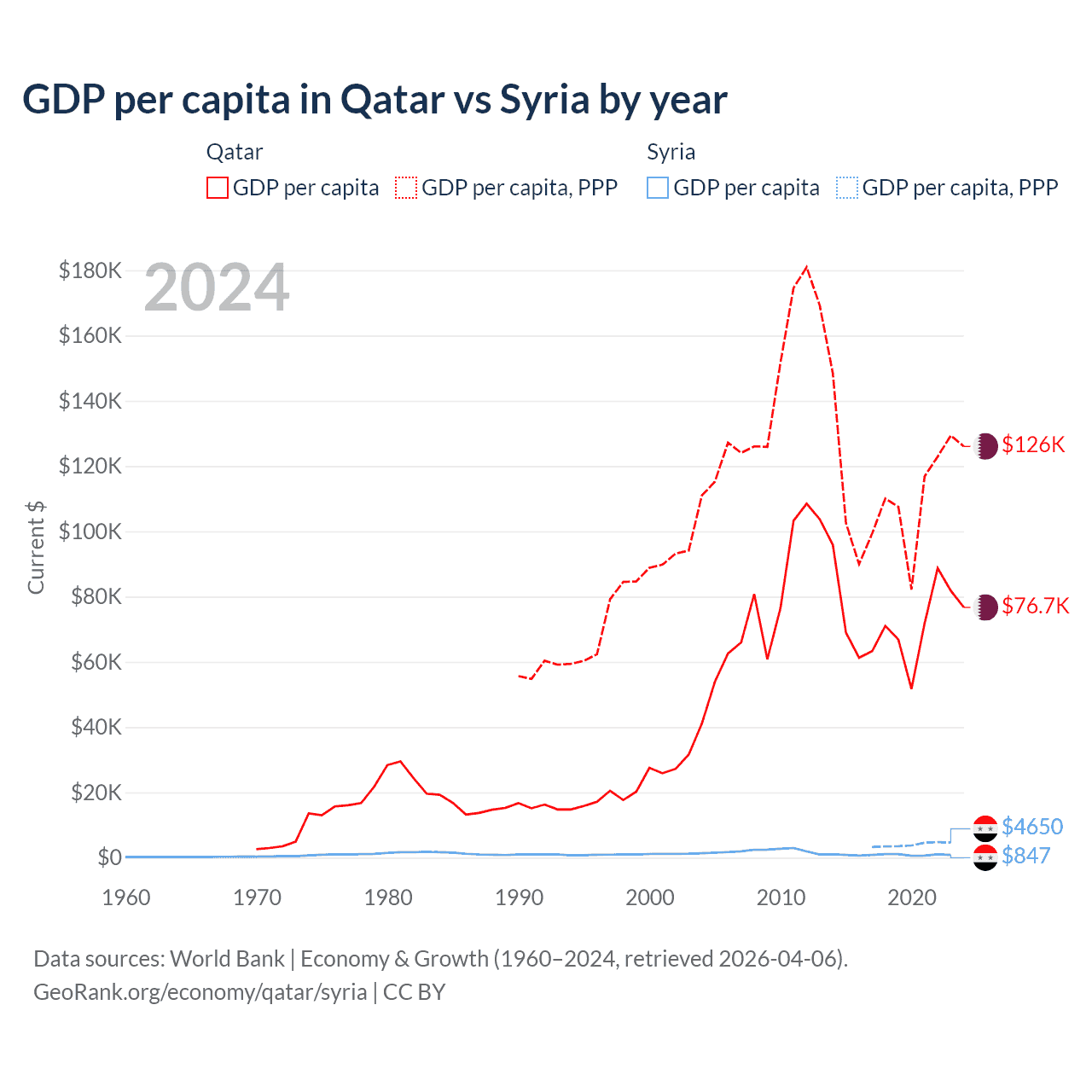 GDP per capita in Qatar vs Syria by year