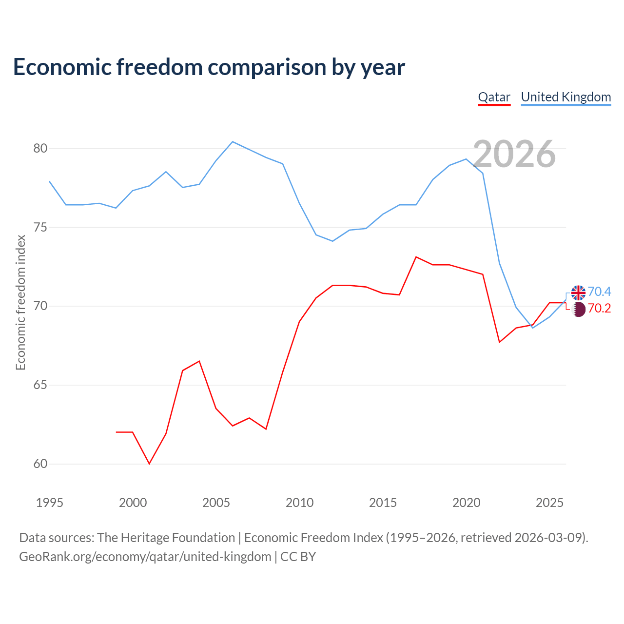 The Economic Freedom Index for Qatar is 70.2, ranking 37/197, compared to 70.4 for the United Kingdom, ranking 35/197. The chart above displays a comparison of annual changes in economic freedom indexes.