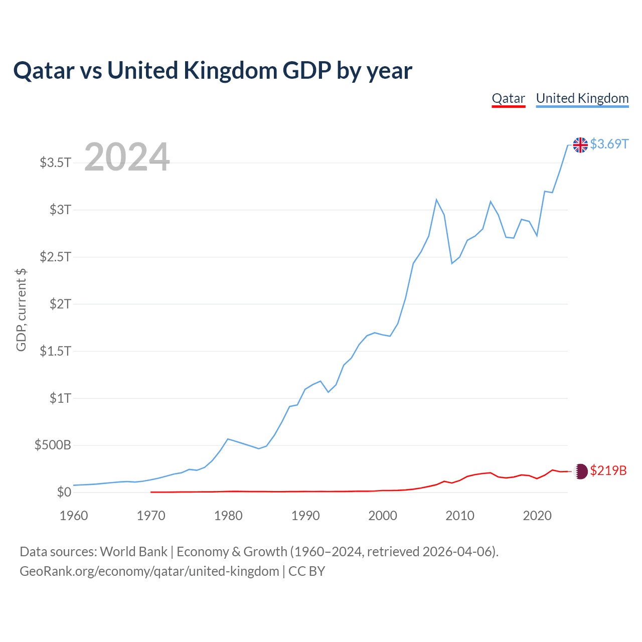 Qatar has a GDP of $219B compared to $3.69T for the United Kingdom, ranking 56/197 and 6/197 by economy size, respectively.