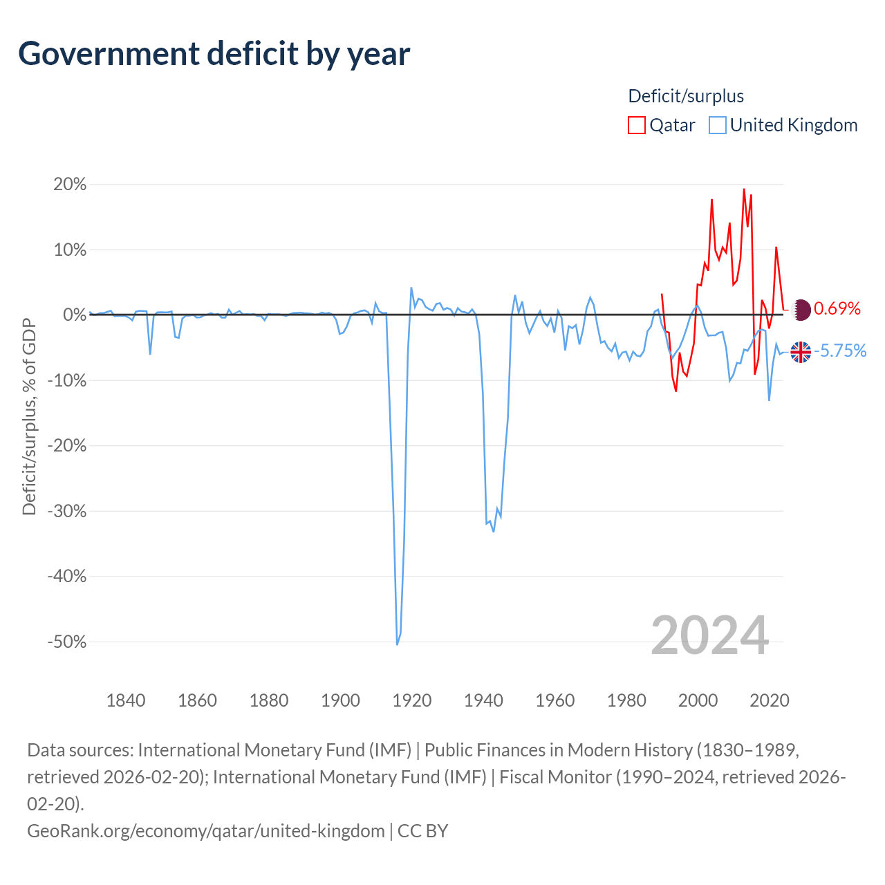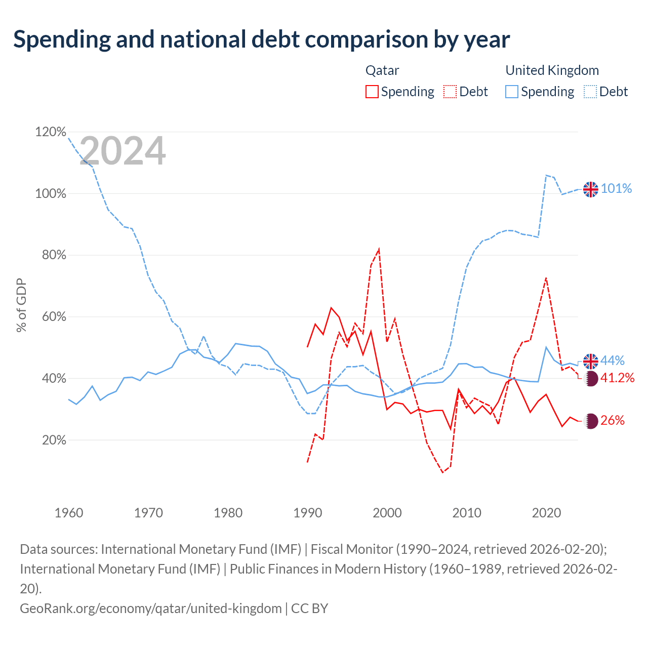 Qatar has $90.2B in government debt (41.2% of GDP), compared to $3.73T (101.2% of GDP) in the United Kingdom.
