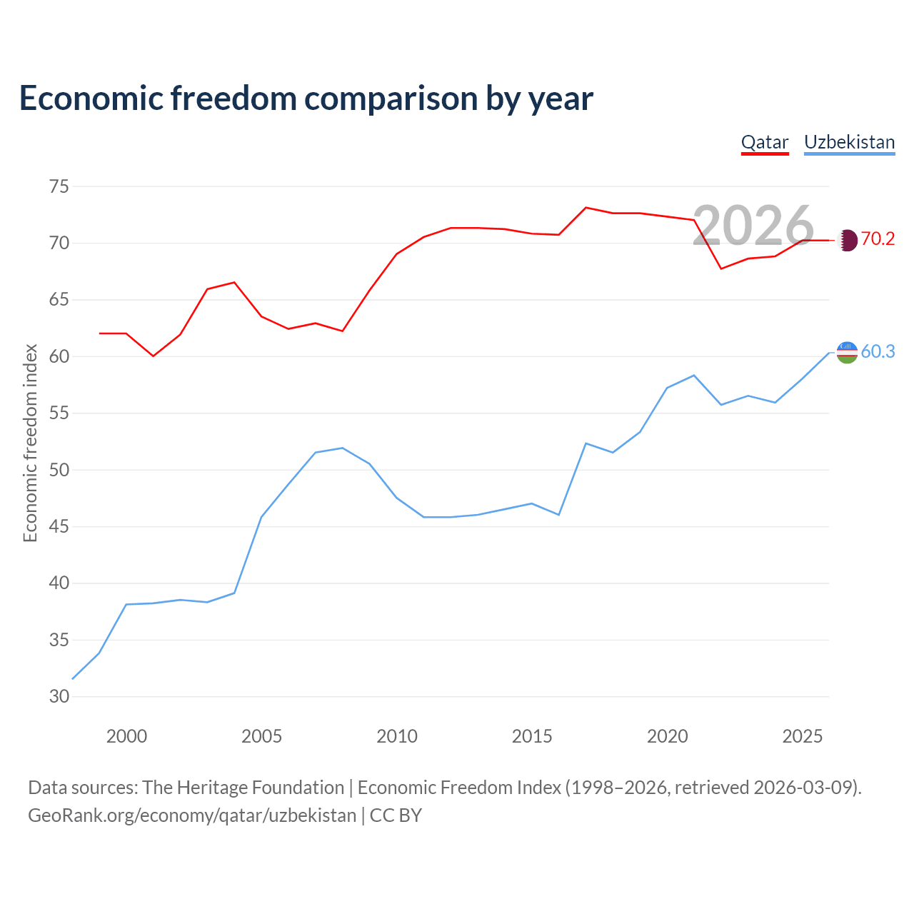 The Economic Freedom Index for Qatar is 70.2, ranking 37/197, compared to 60.3 for Uzbekistan, ranking 94/197. The chart above displays a comparison of annual changes in economic freedom indexes.