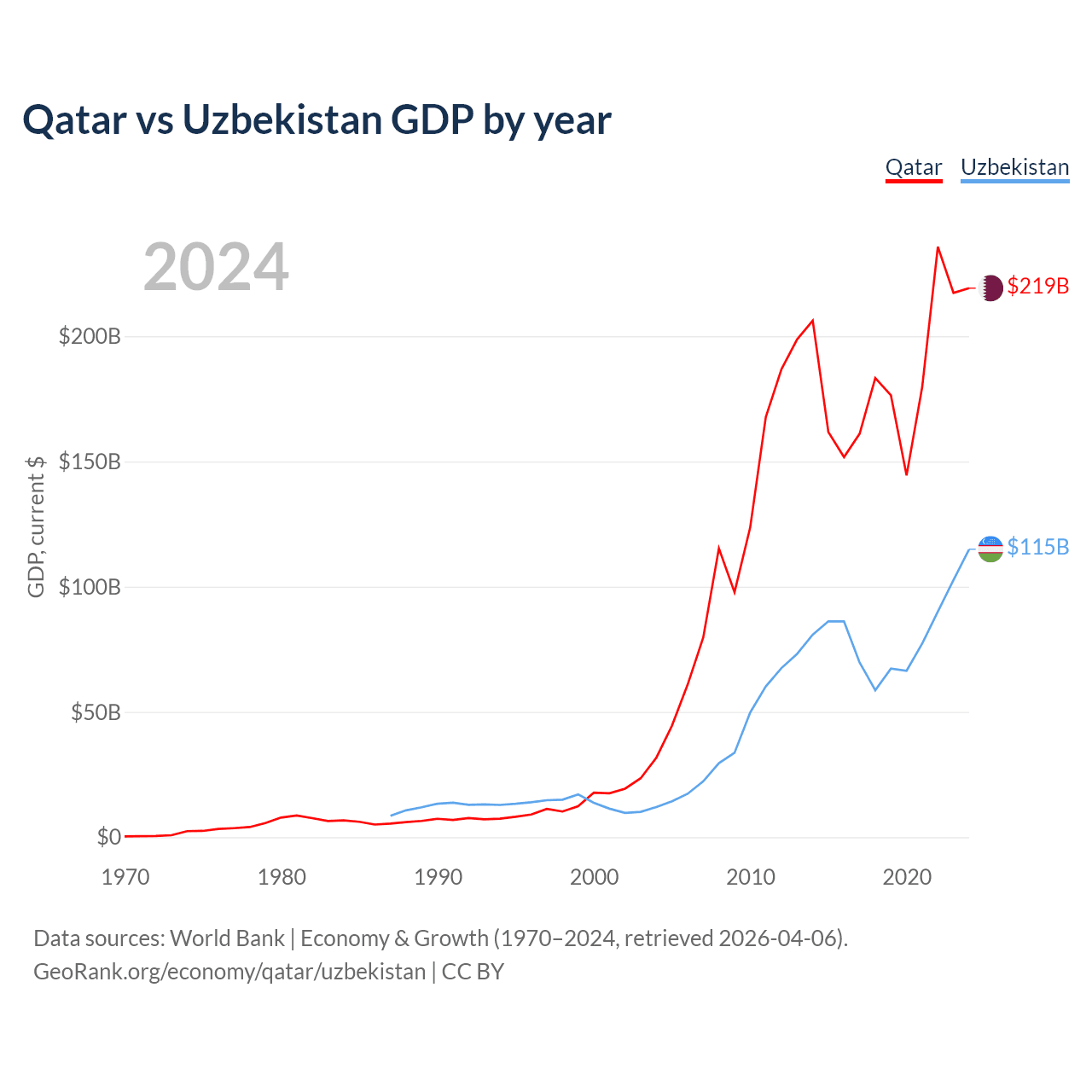 Qatar has a GDP of $219B compared to $115B for Uzbekistan, ranking 56/197 and 66/197 by economy size, respectively.