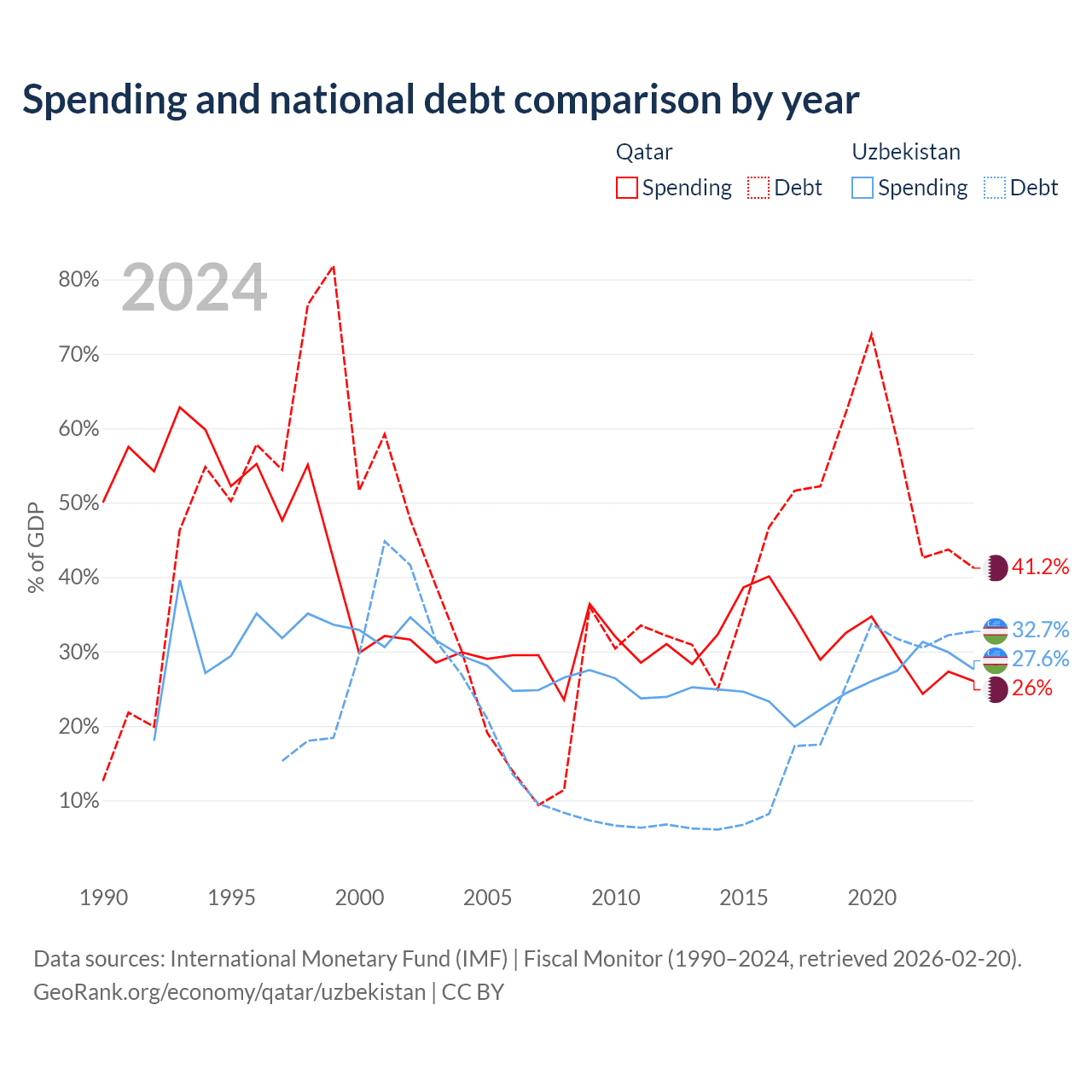 Qatar has $90.2B in government debt (41.2% of GDP), compared to $37.5B (32.7% of GDP) in Uzbekistan.