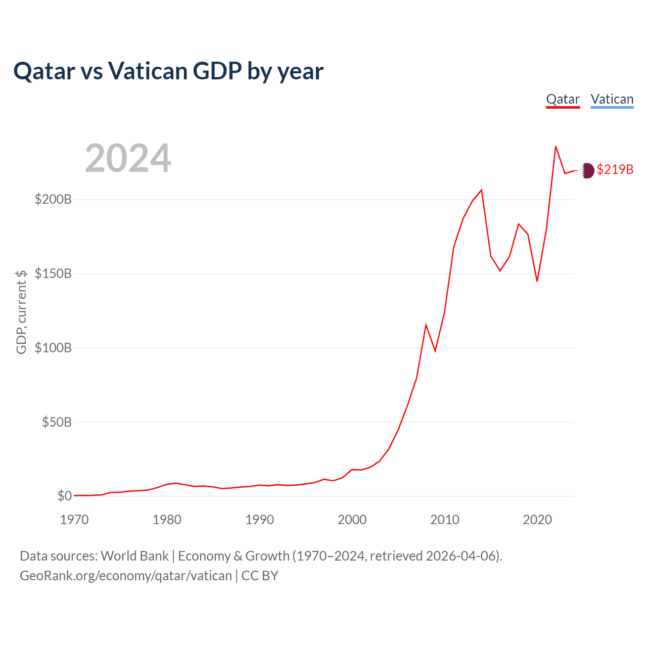 Qatar has a GDP of $219B compared to $19.8M for the Vatican, ranking 56/197 and 197/197 by economy size, respectively.