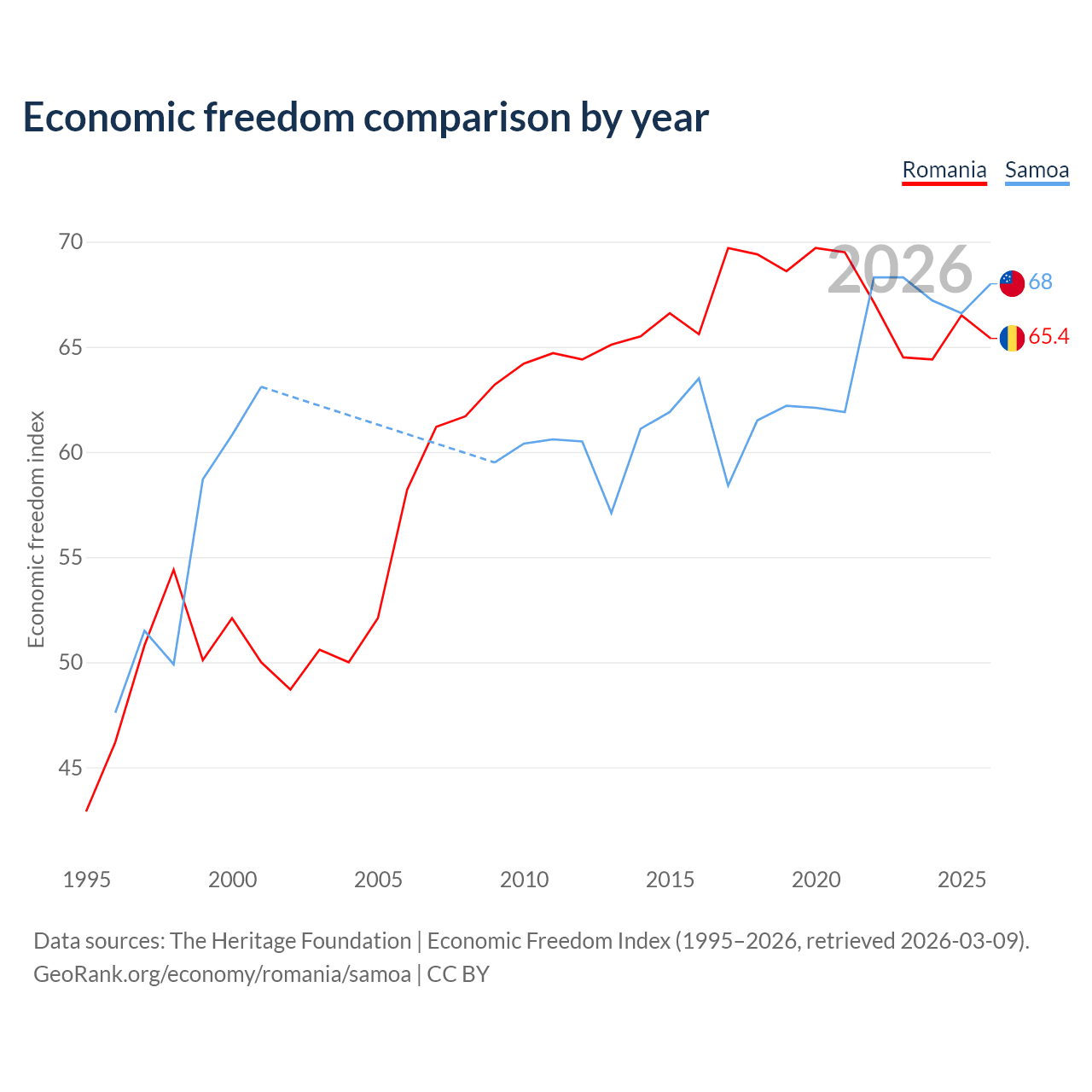 The Economic Freedom Index for Romania is 65.4, ranking 64/197, compared to 68 for Samoa, ranking 52/197. The chart above displays a comparison of annual changes in economic freedom indexes.