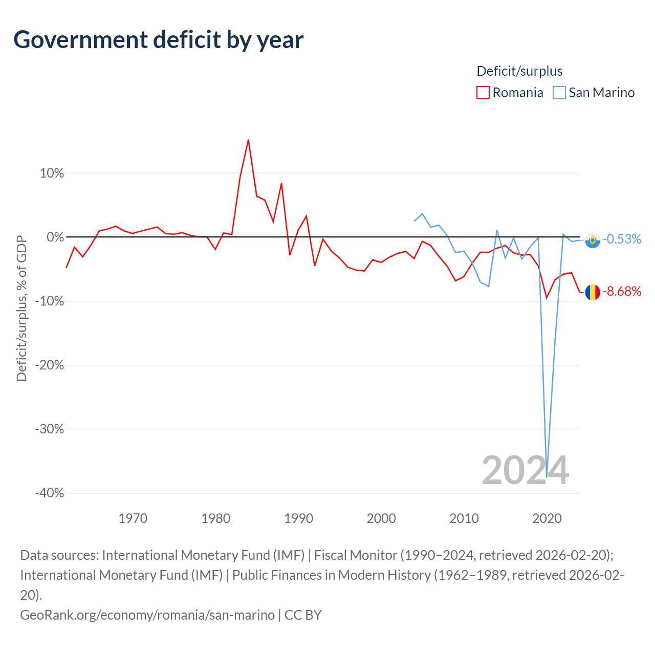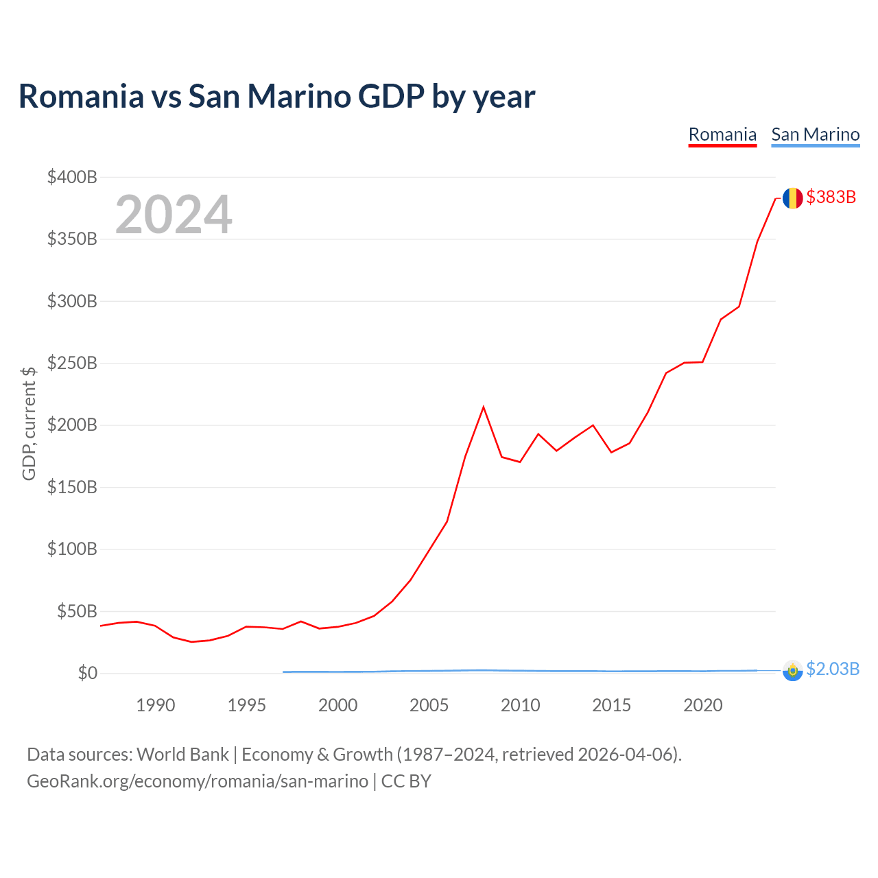 Romania has a GDP of $383B compared to $2.03B for San Marino, ranking 42/197 and 180/197 by economy size, respectively.