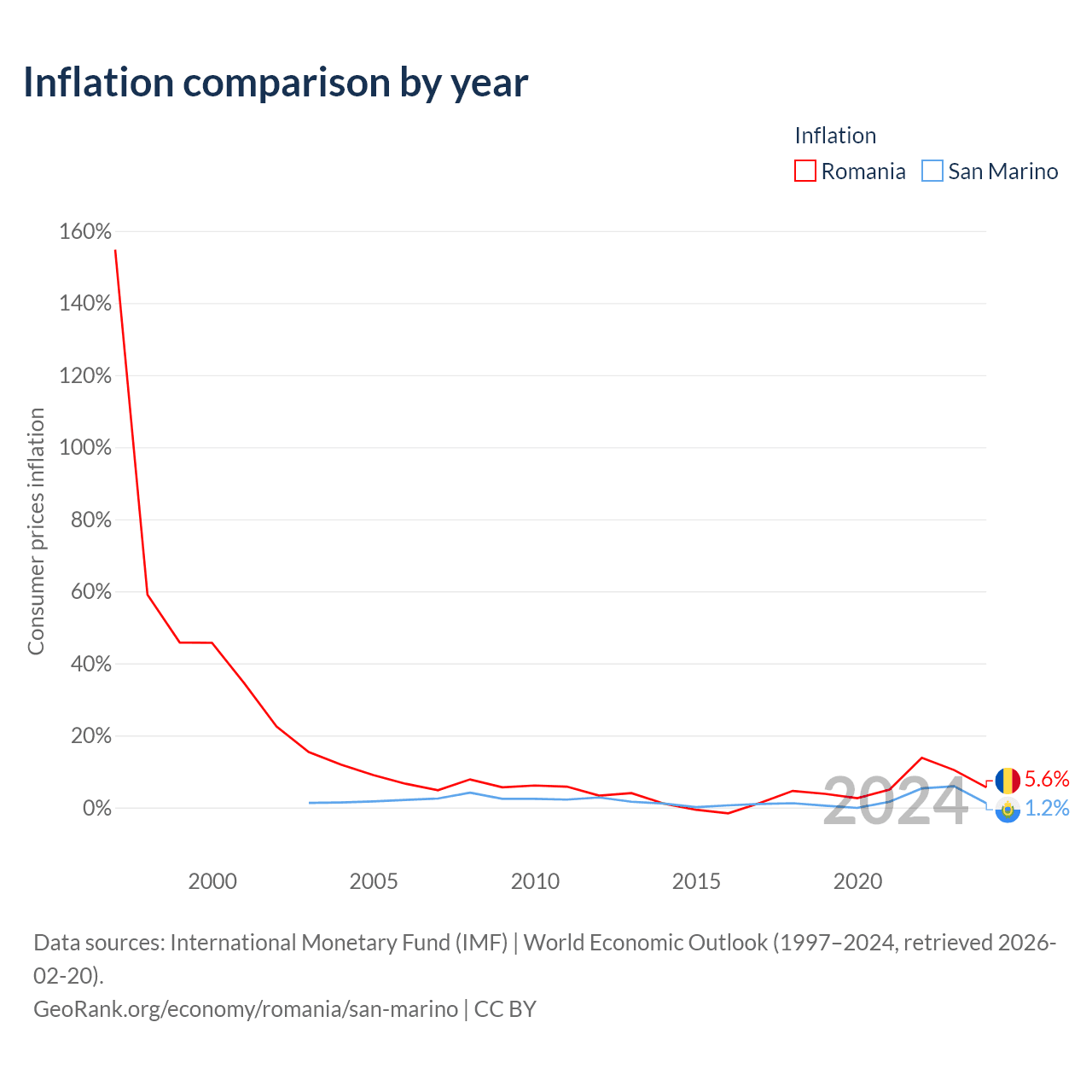 Romania's GDP per capita is $20,080, ranking 58/197, compared to $59,880 in San Marino, ranking 15/197. Adjusted for purchasing power (GDP per capita PPP), Romania ranks 47th at $49,077, while San Marino ranks 17th at $78,745.