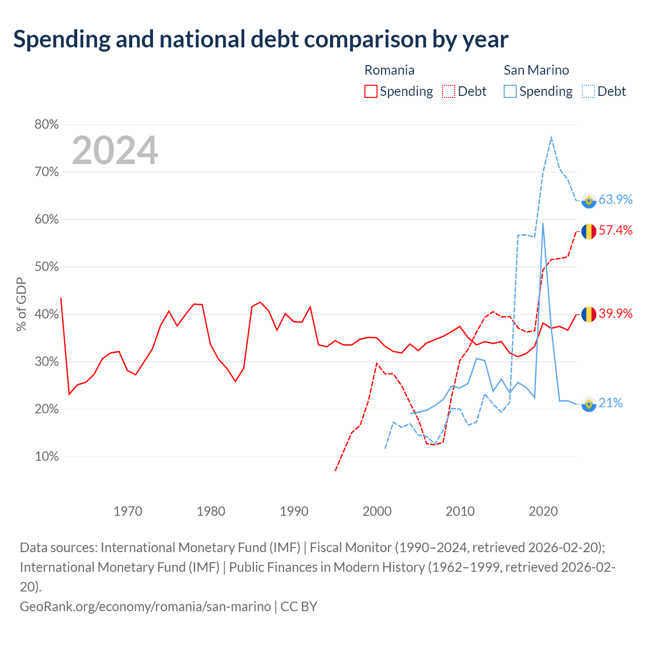 Romania has $220B in government debt (57.4% of GDP), compared to $1.39B (63.9% of GDP) in San Marino.