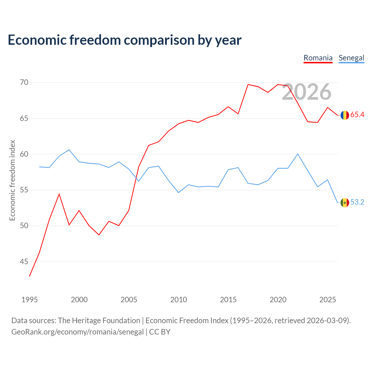 The Economic Freedom Index for Romania is 65.4, ranking 64/197, compared to 53.2 for Senegal, ranking 140/197. The chart above displays a comparison of annual changes in economic freedom indexes.