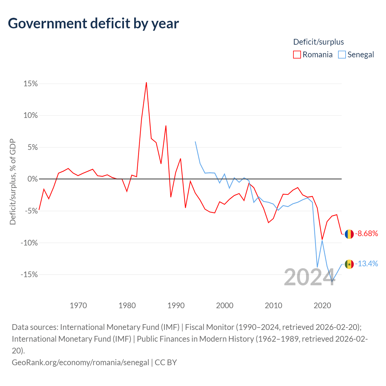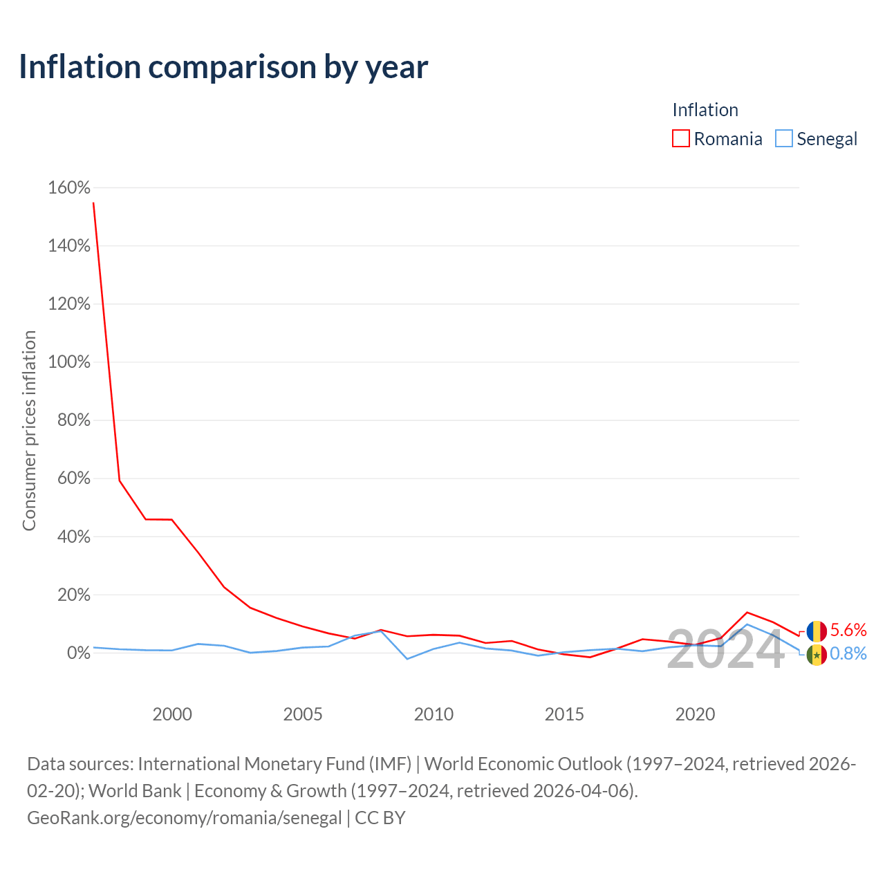 Romania has a GDP of $383B compared to $32.8B for Senegal, ranking 42/197 and 109/197 by economy size, respectively.