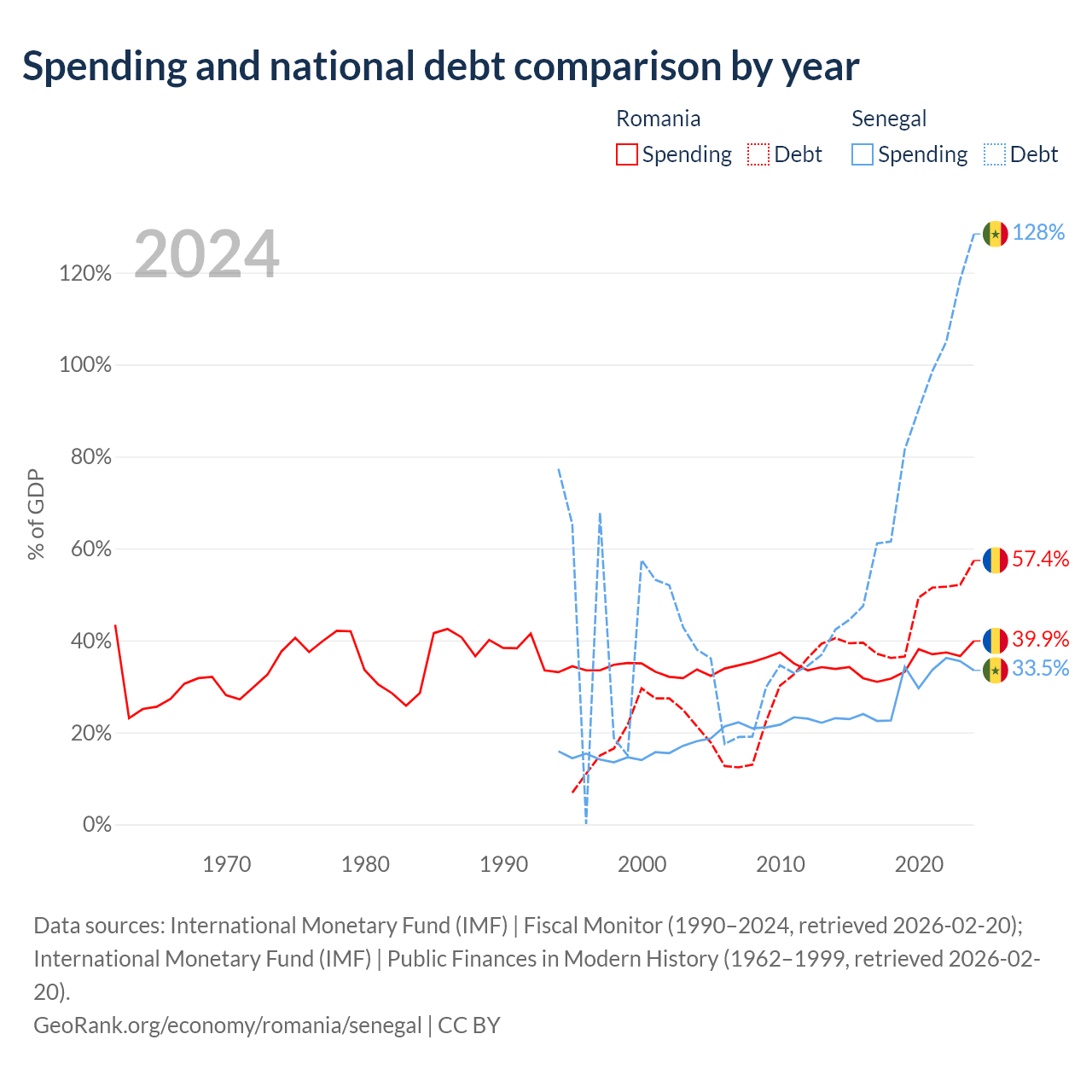 Romania has $220B in government debt (57.4% of GDP), compared to $42.1B (128.4% of GDP) in Senegal.