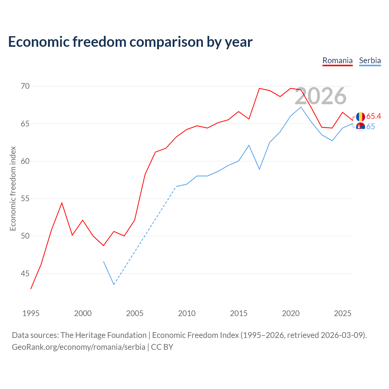 The Economic Freedom Index for Romania is 65.4, ranking 64/197, compared to 65 for Serbia, ranking 68/197. The chart above displays a comparison of annual changes in economic freedom indexes.
