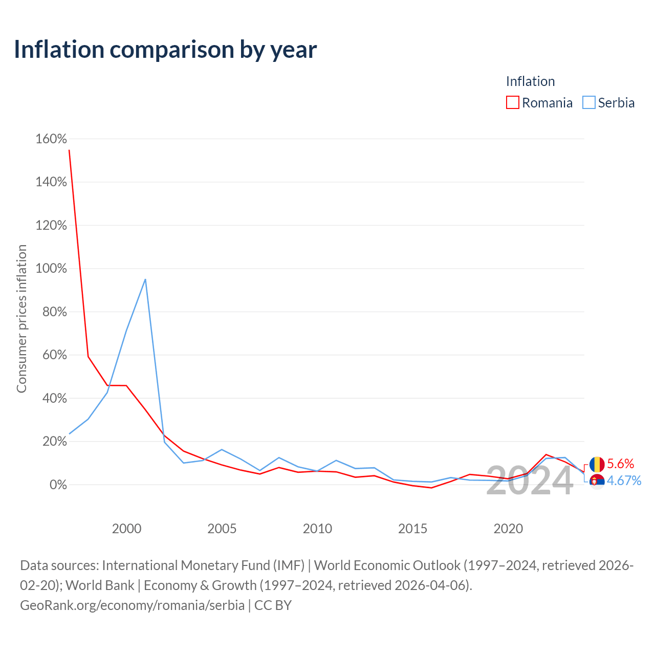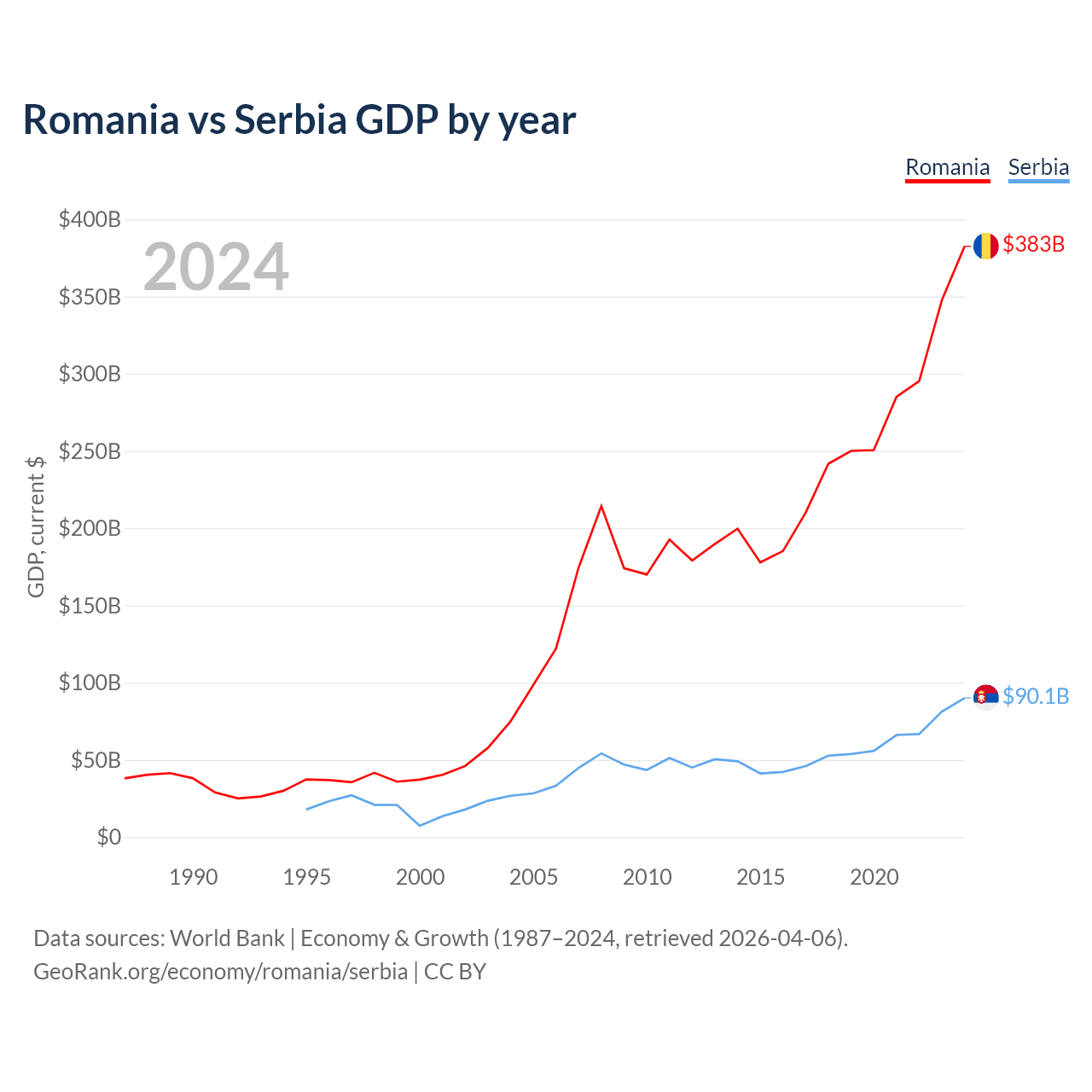 Romania has a GDP of $383B compared to $90.1B for Serbia, ranking 42/197 and 76/197 by economy size, respectively.
