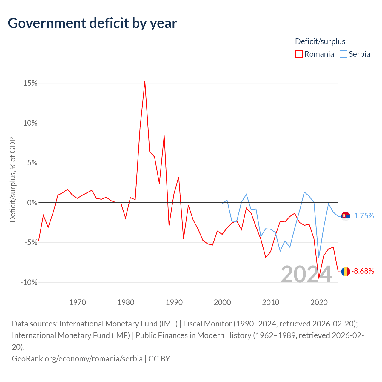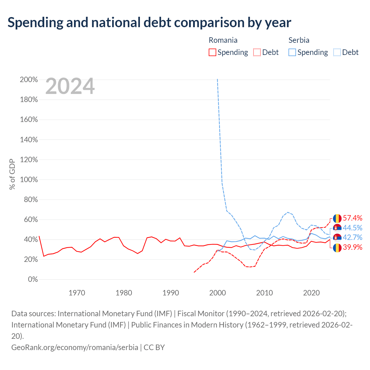 Romania has $220B in government debt (57.4% of GDP), compared to $40.1B (44.5% of GDP) in Serbia.