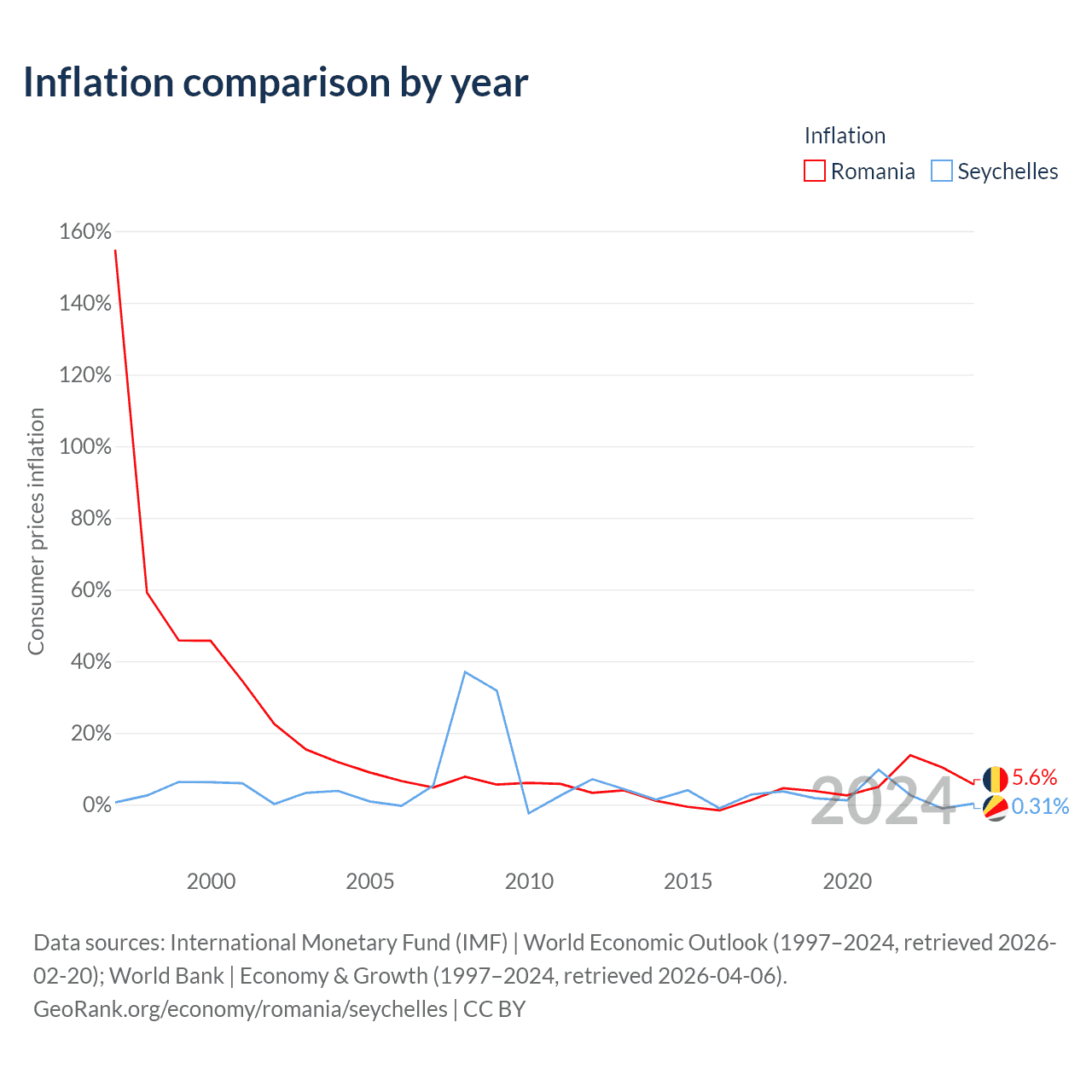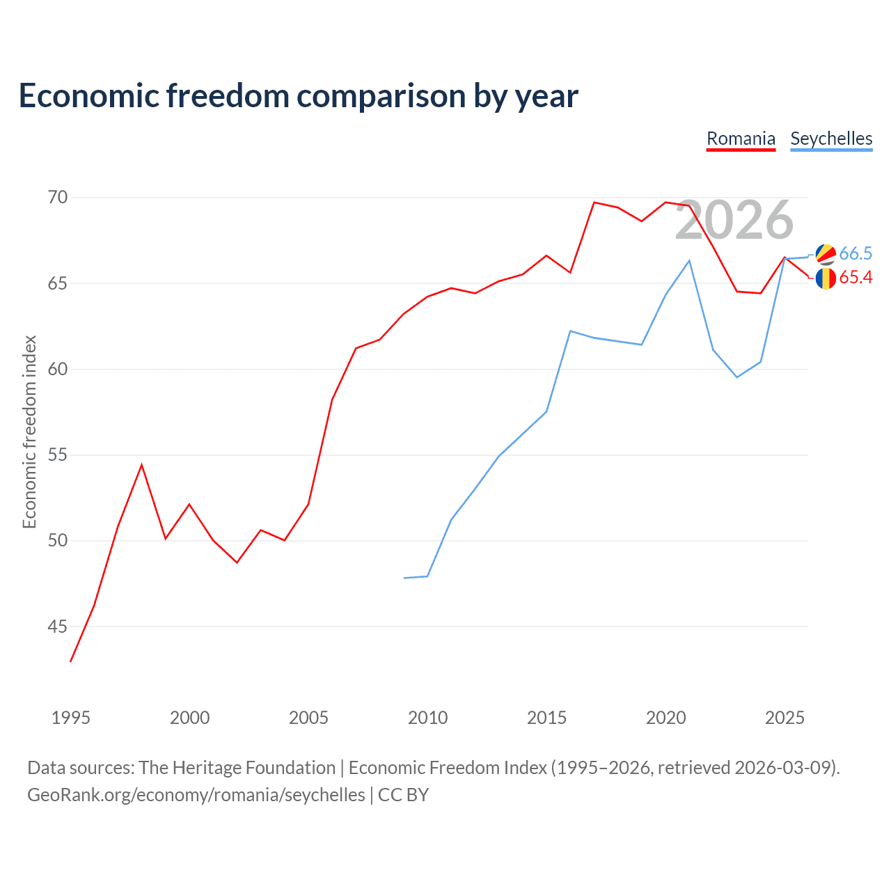 The Economic Freedom Index for Romania is 65.4, ranking 64/197, compared to 66.5 for the Seychelles, ranking 60/197. The chart above displays a comparison of annual changes in economic freedom indexes.