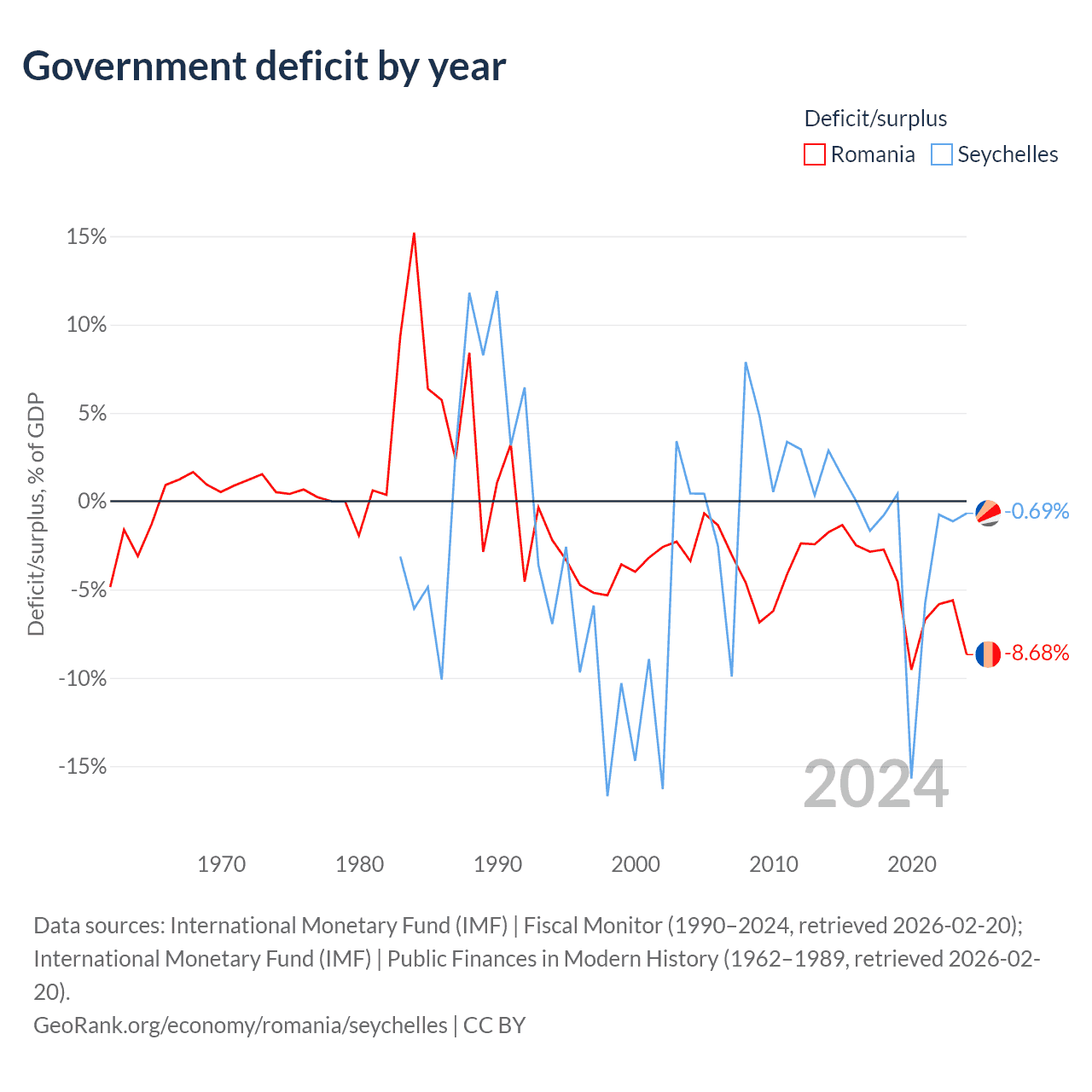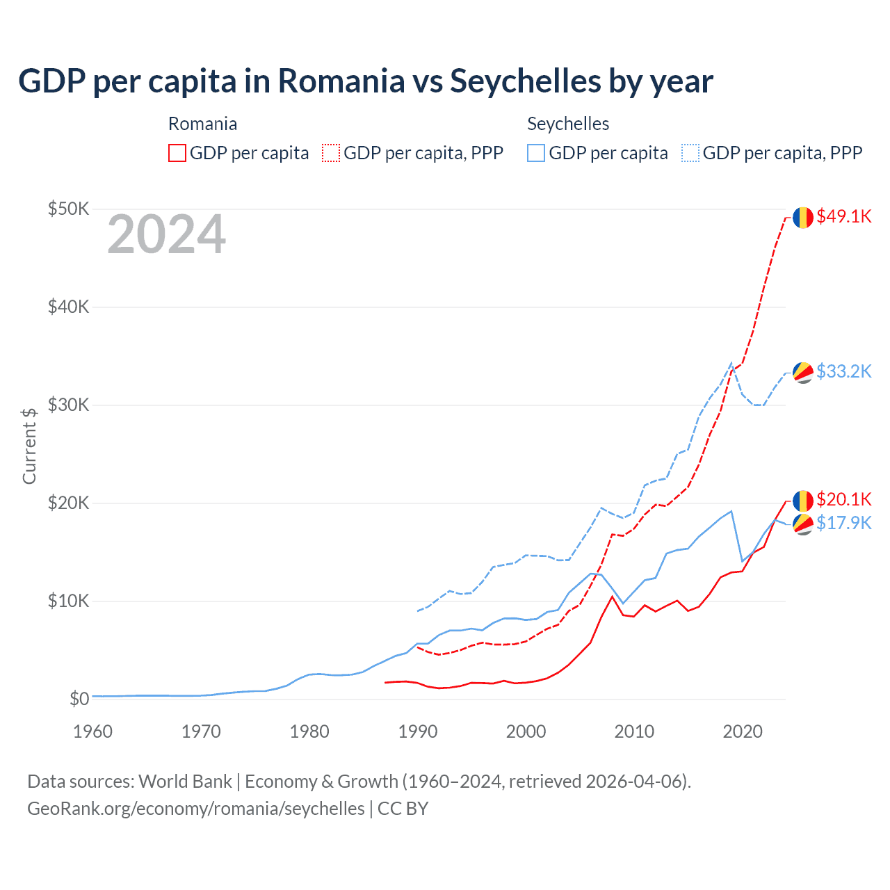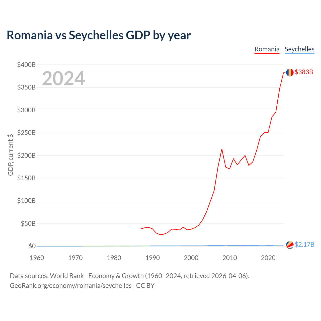 Romania has a GDP of $383B compared to $2.17B for the Seychelles, ranking 42/197 and 178/197 by economy size, respectively.