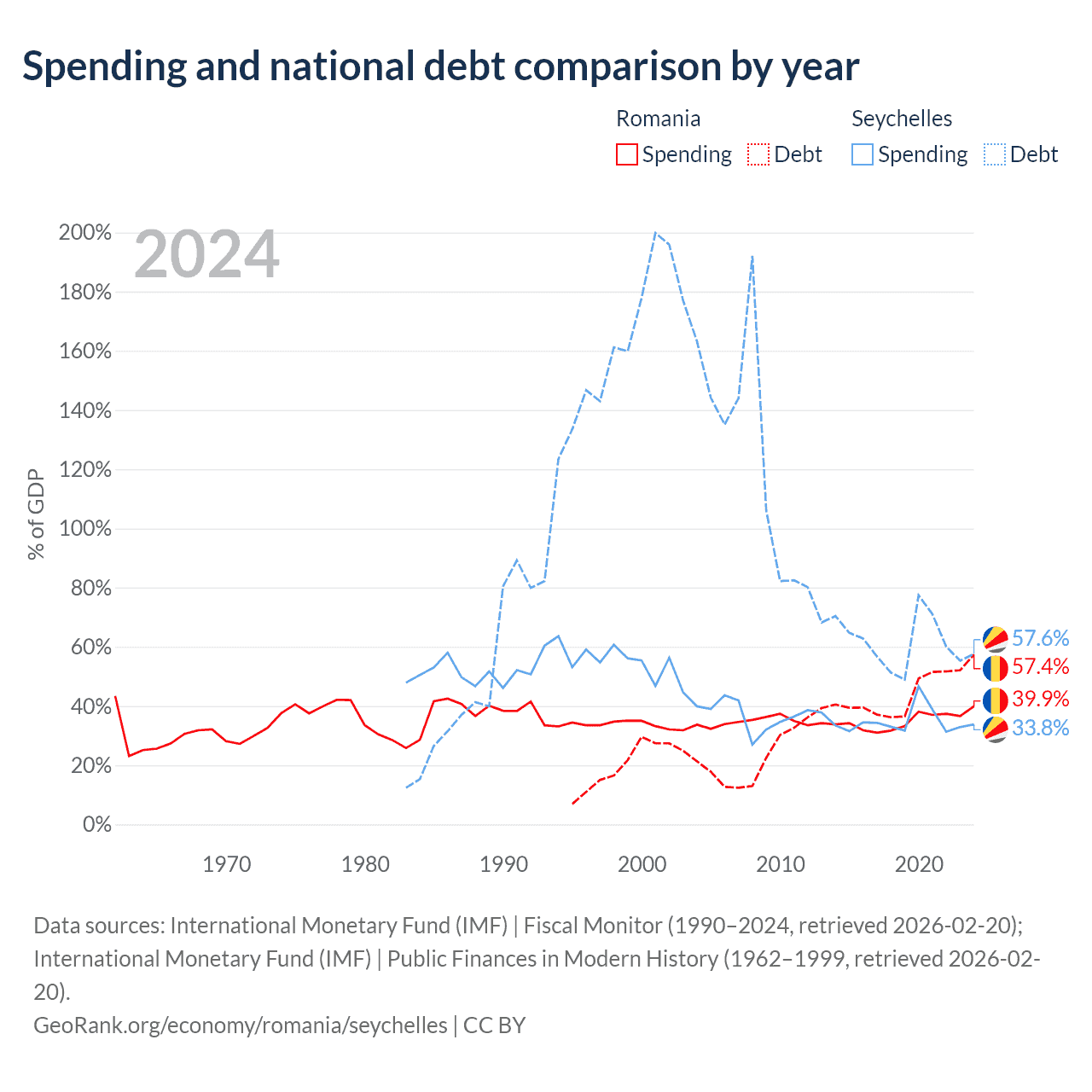 Romania has $220B in government debt (57.4% of GDP), compared to $1.25B (57.6% of GDP) in the Seychelles.