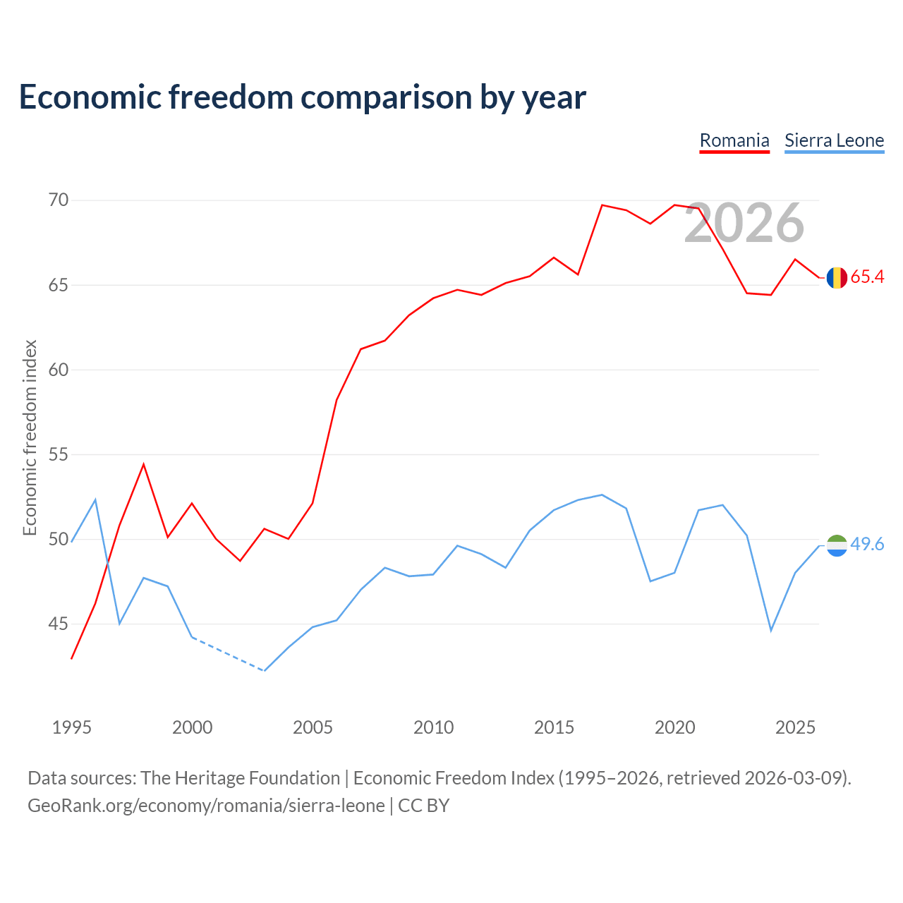 The Economic Freedom Index for Romania is 65.4, ranking 64/197, compared to 49.6 for Sierra Leone, ranking 165/197. The chart above displays a comparison of annual changes in economic freedom indexes.