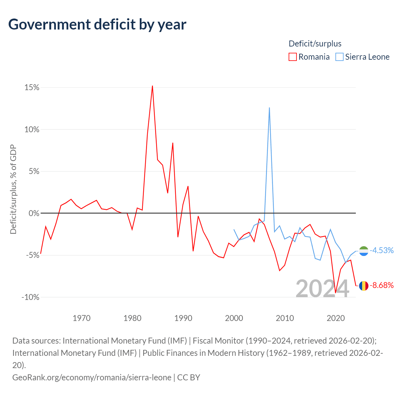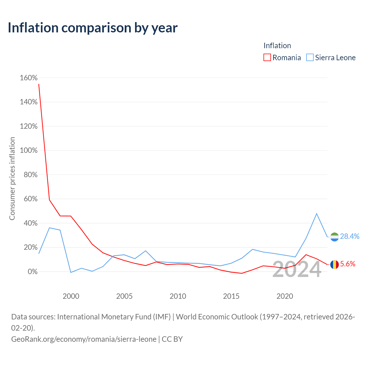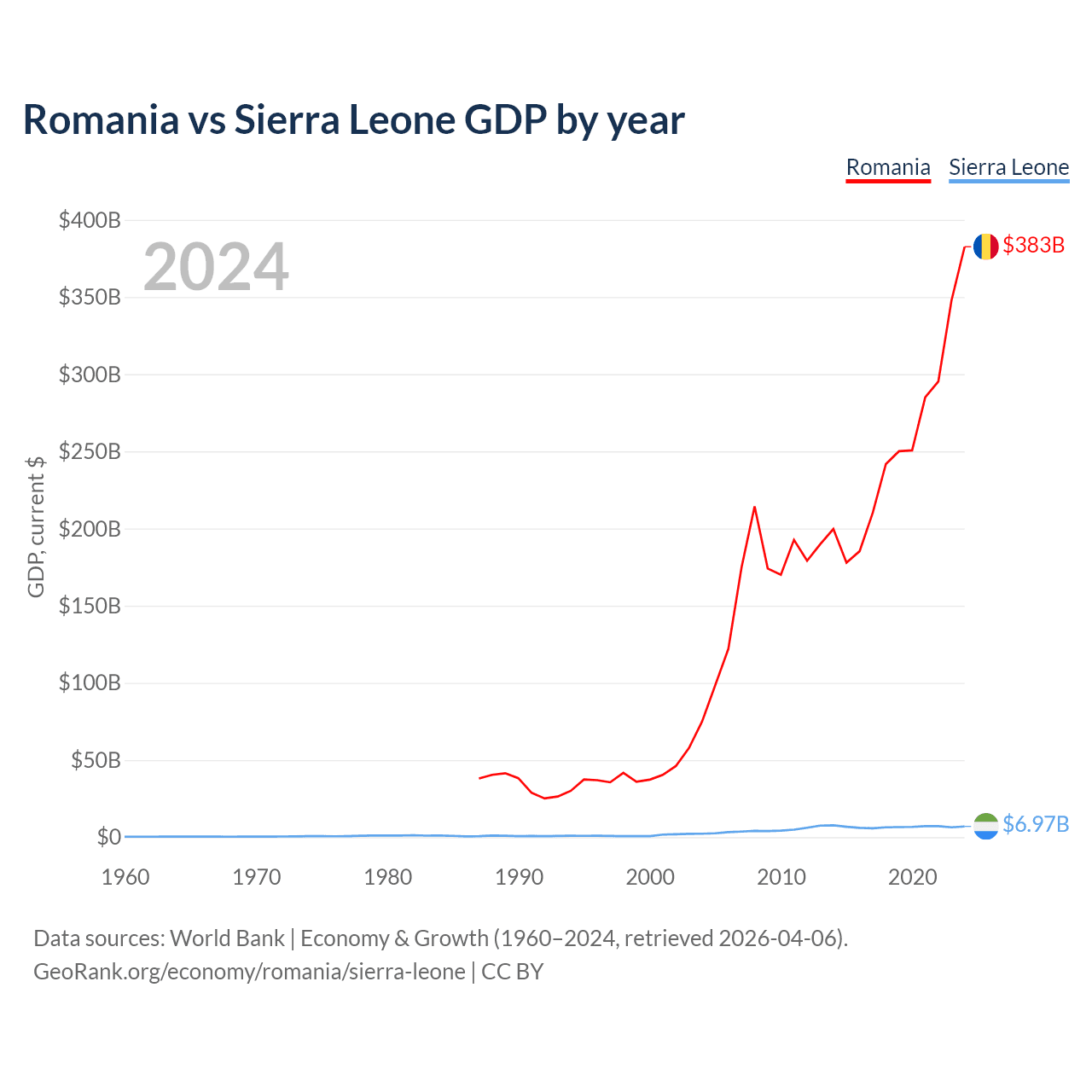 Romania has a GDP of $383B compared to $6.97B for Sierra Leone, ranking 42/197 and 160/197 by economy size, respectively.