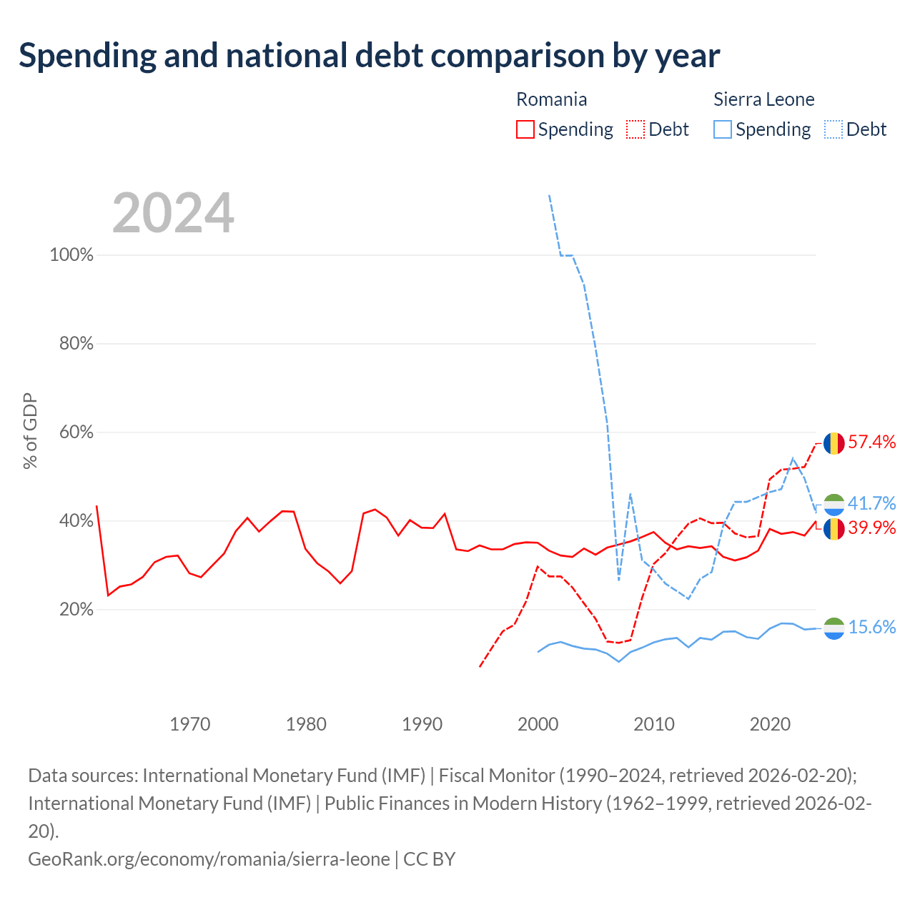 Romania has $220B in government debt (57.4% of GDP), compared to $2.91B (41.7% of GDP) in Sierra Leone.