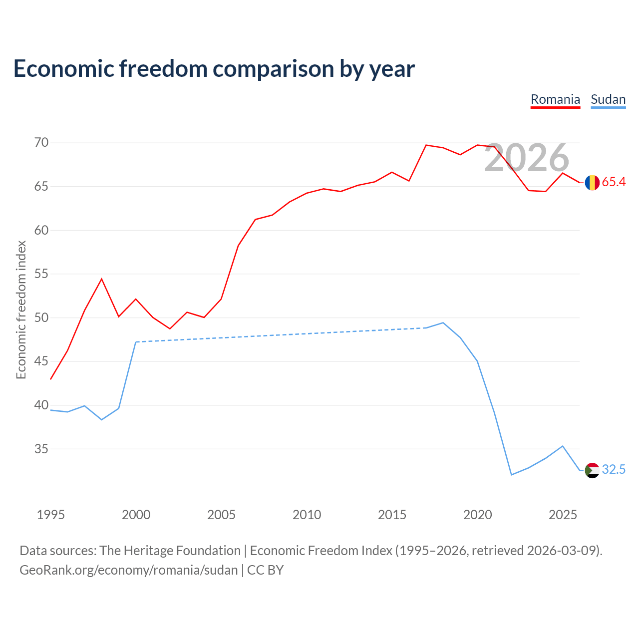 The Economic Freedom Index for Romania is 65.4, ranking 64/197, compared to 32.5 for Sudan, ranking 191/197. The chart above displays a comparison of annual changes in economic freedom indexes.