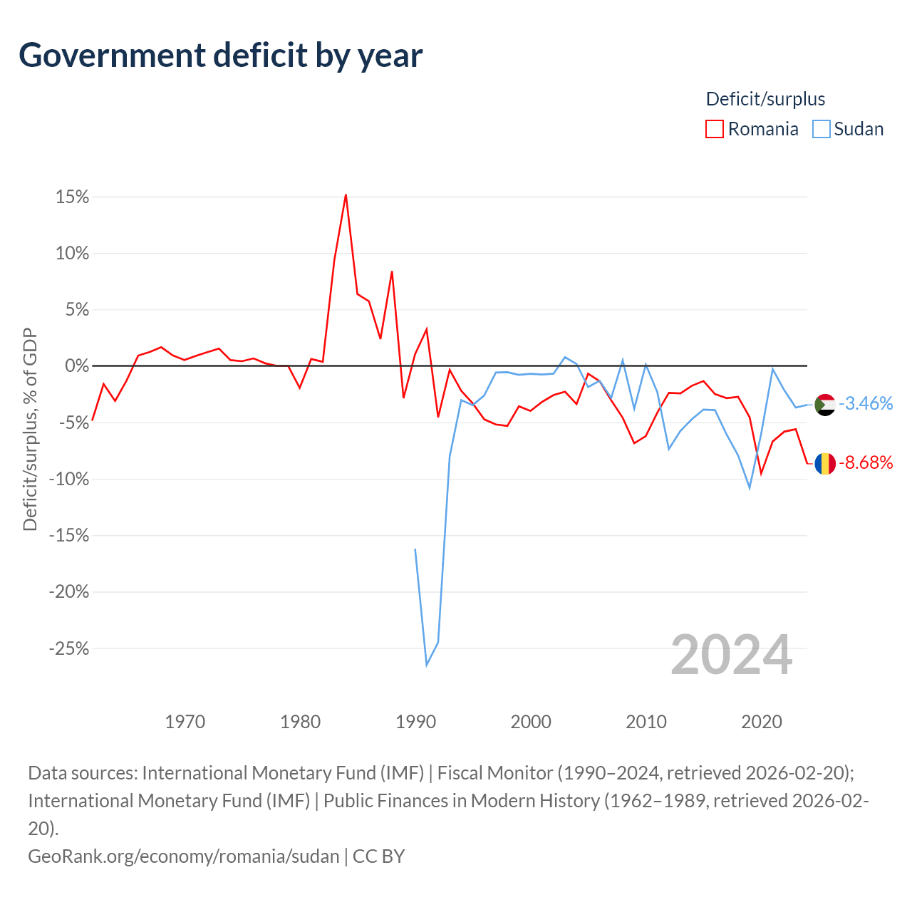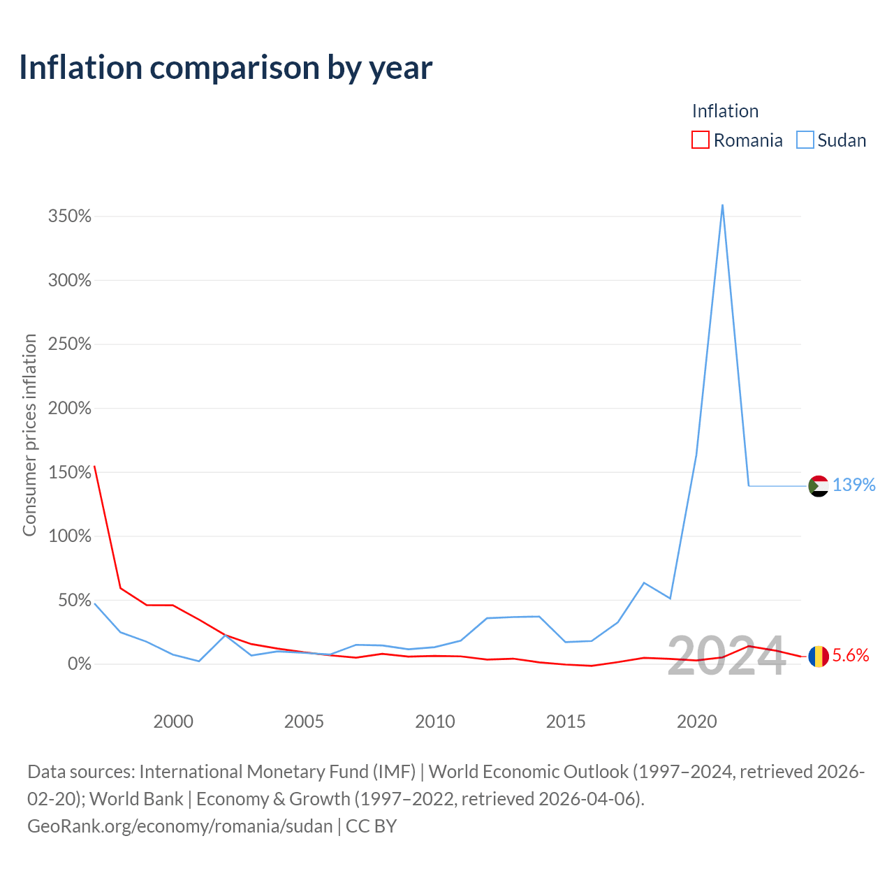 Romania has a GDP of $383B compared to $49.7B for Sudan, ranking 42/197 and 94/197 by economy size, respectively.