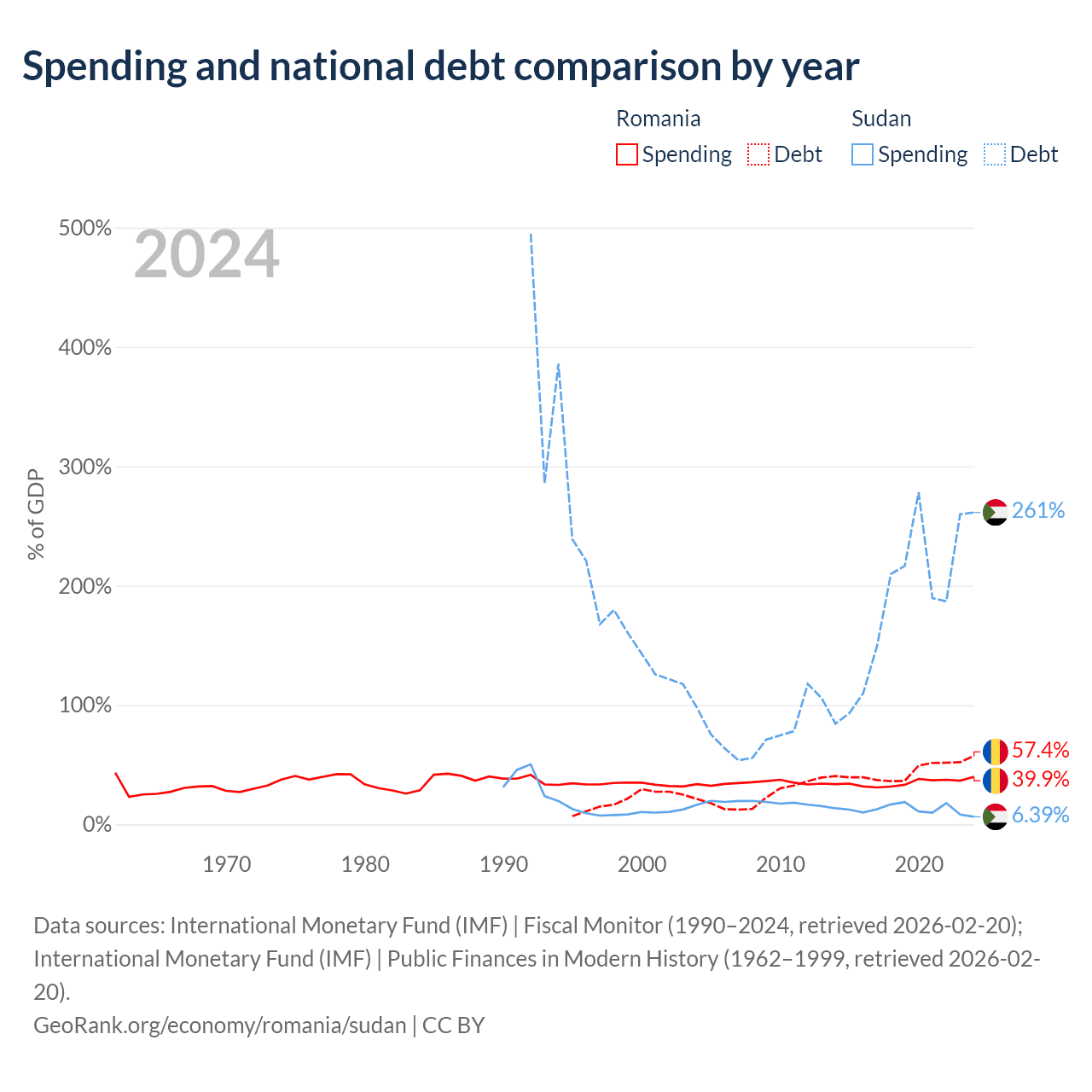 Romania has $220B in government debt (57.4% of GDP), compared to $130B (261.4% of GDP) in Sudan.