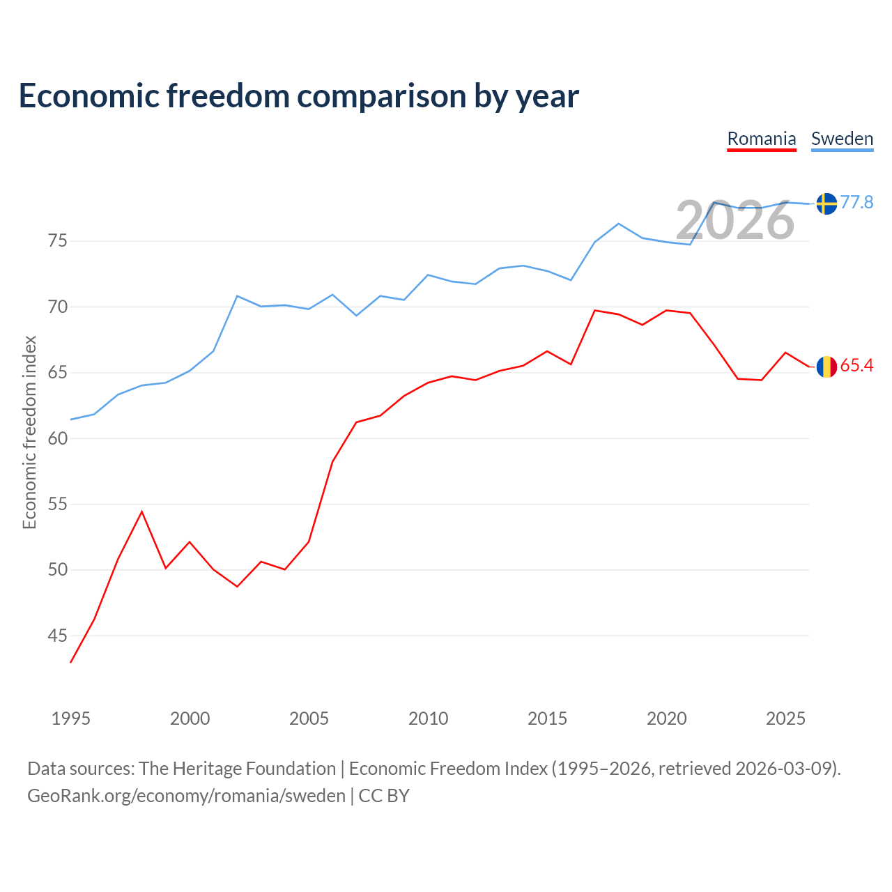 The Economic Freedom Index for Romania is 65.4, ranking 64/197, compared to 77.8 for Sweden, ranking 14/197. The chart above displays a comparison of annual changes in economic freedom indexes.